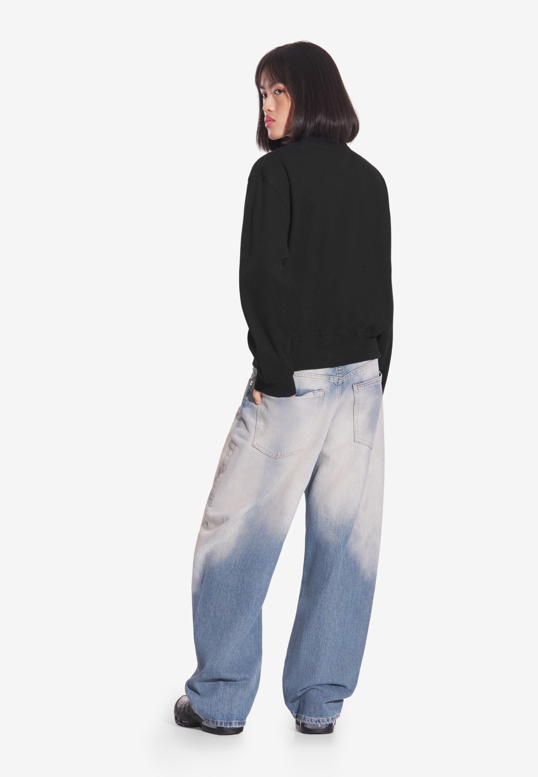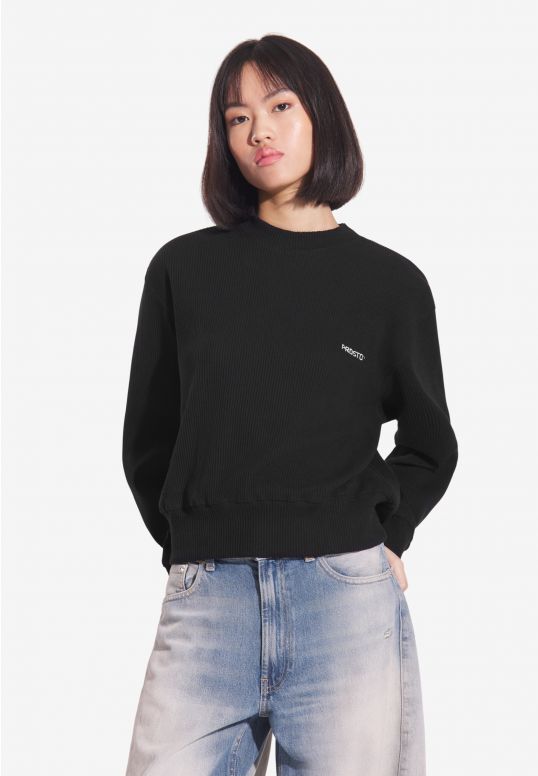 Crewneck Ribbed Black – damska bluza z kolekcji Prosto w klasycznym, czarnym kolorze. W całości wykonana z prążkowanej dzianiny bawełnianej z domieszką elastanu, dzięki czemu jest miękka, elastyczna i świetnie dopasowuje się do sylwetki. Luźny, oversize’owy krój z obniżoną linią ramion i dłuższymi rękawami nadaje jej swobodny, cozy charakter. To bluza, która układa się idealnie – zarówno w codziennych, luźnych zestawach z dresami, jak i w bardziej dopracowanych lookach. Subtelny haft z logo Prosto dopełnia całość minimalistycznym detalem.