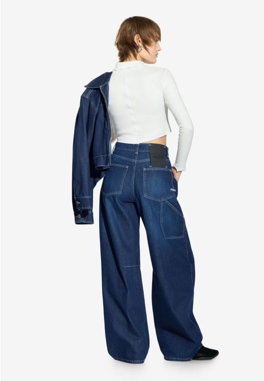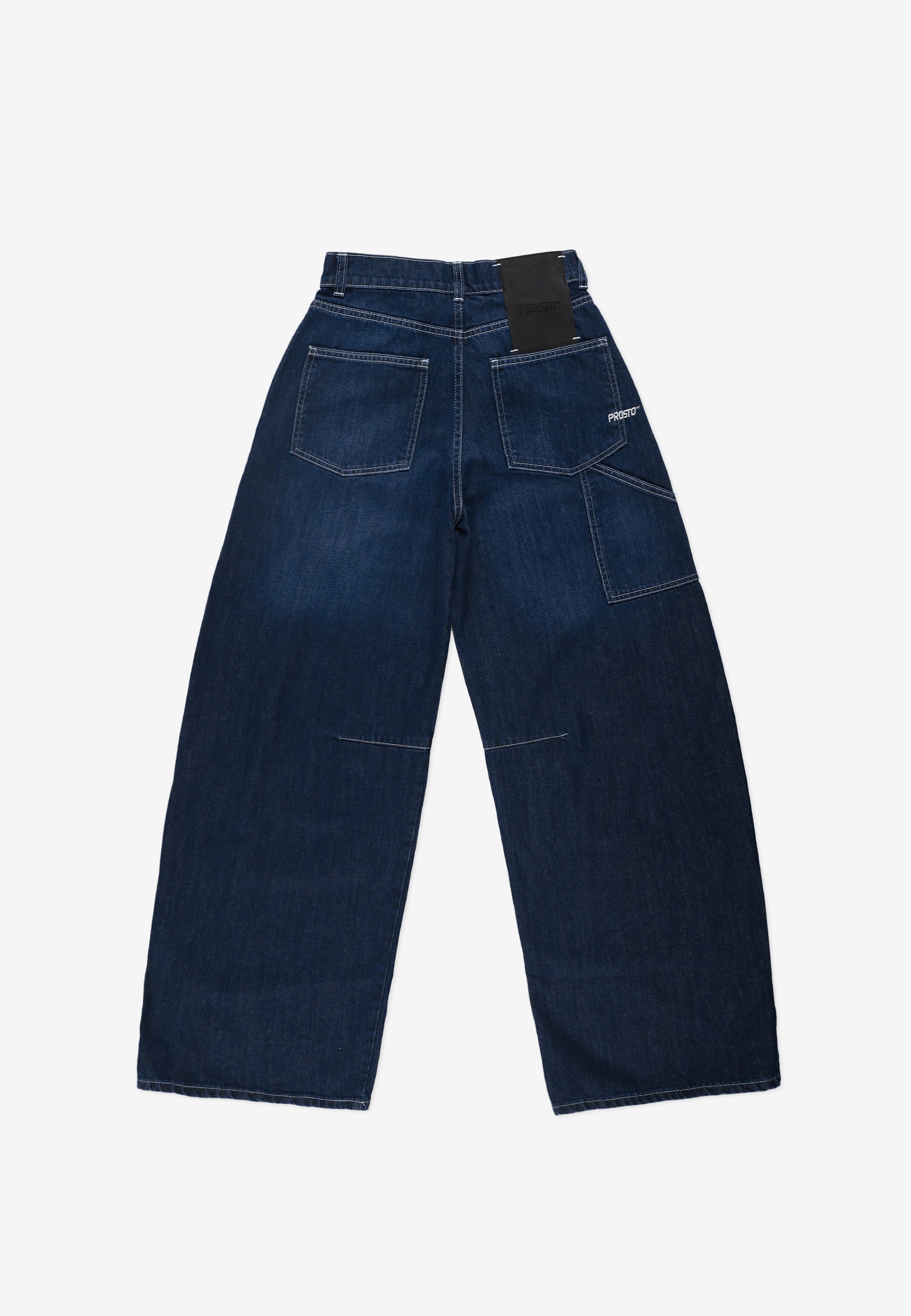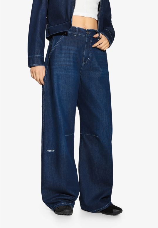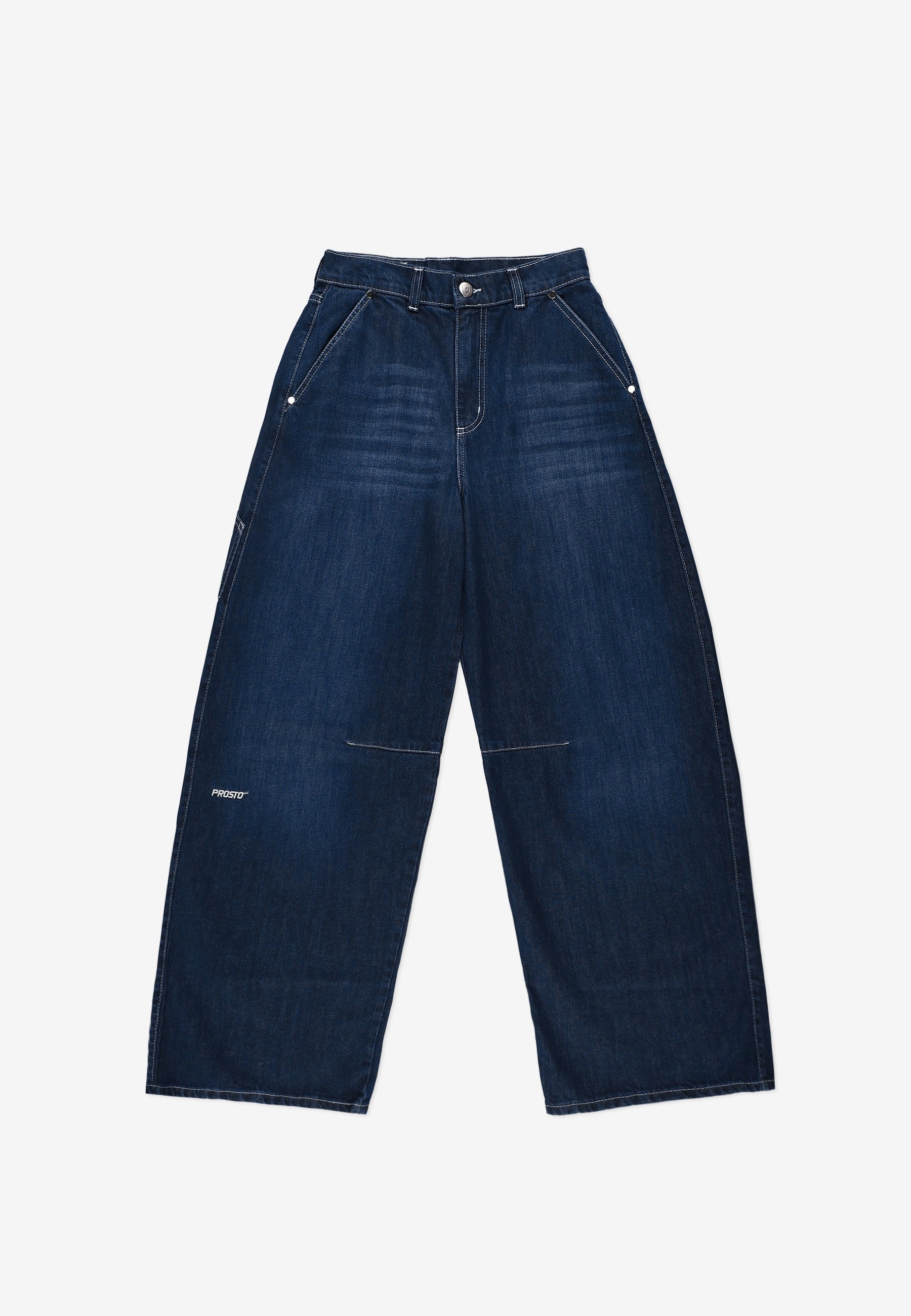 Dart Pants Work Navy – damskie spodnie z kolekcji Prosto w kolorze spranego navy blue. Mają luźny, baggy krój z charakterystycznymi zaszewkami profilującymi kolano, które nadają nogawce formę i lekko zaokrąglony kształt. Uszyte w 100 % z denimu z bawełny – materiał jest solidny, ale dzięki praniu zyskuje miękkość i naturalny efekt vintage. Z tyłu i z boku umieszczono naszywane kieszenie, a w pasie znajdują się szlufki i metalowy guzik z logo. Na jednej z nogawek znajduje się haft Prosto, a na tyle – czarna metka z ekoskóry z wytłoczonym logo. To nowoczesna interpretacja klasycznych spodni roboczych w kobiecym, streetowym wydaniu.