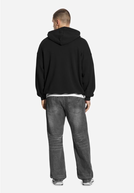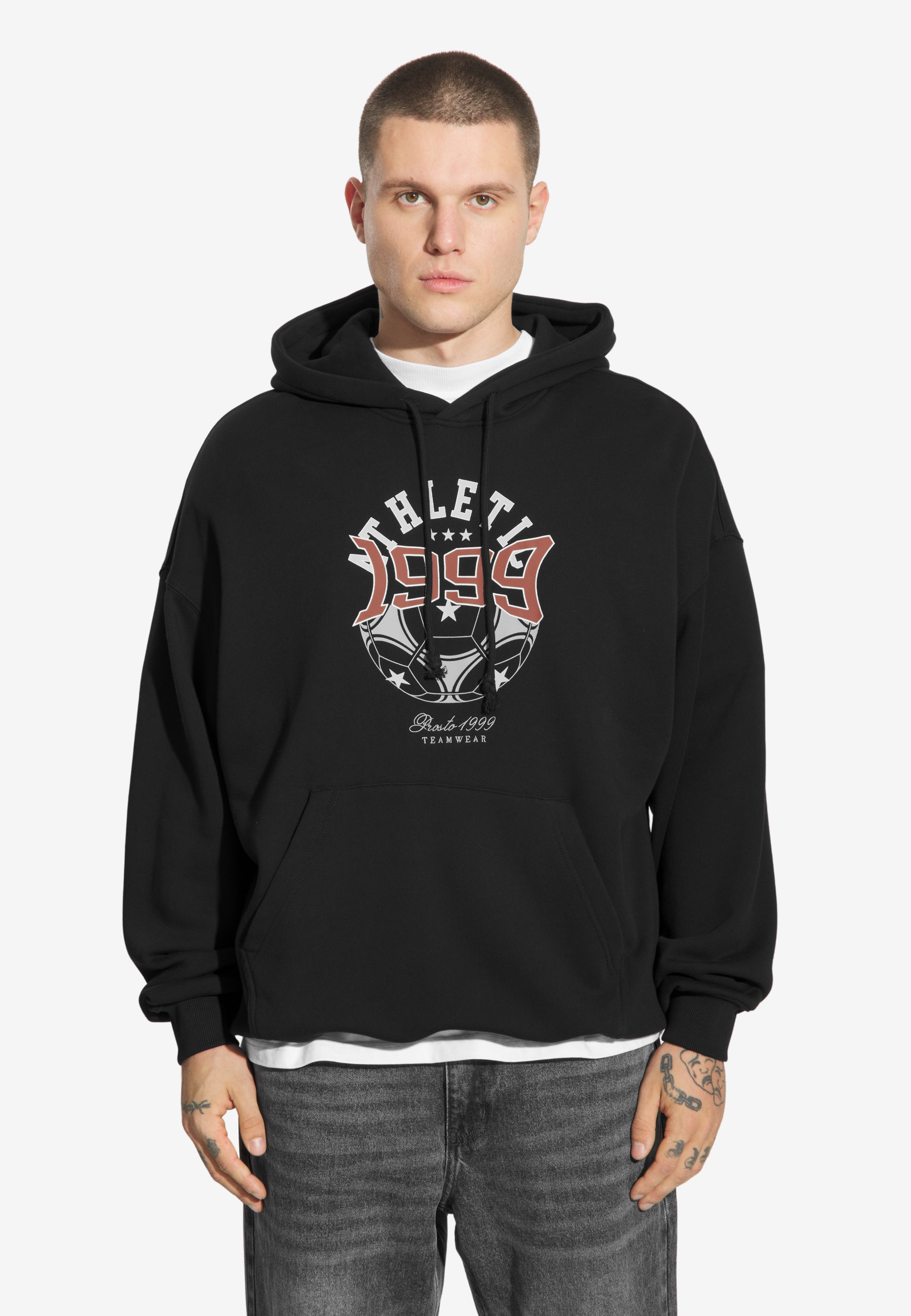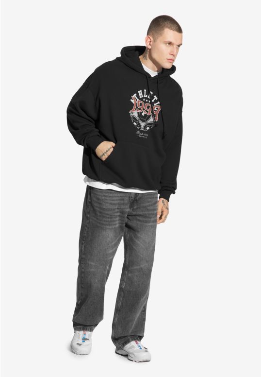 Hoodie Athletic Black – oversize’owy krój i połączenie nadruku z haftem nadają bluzie mocny, sportowo–streetwearowy charakter. Wyrazisty front z motywem 1999 przyciąga uwagę, a gruba, miękka dzianina bawełniana zapewnia komfort w noszeniu. Ściągany kaptur i elastyczne wykończenia zwiększają wygodę i utrzymują fason.
