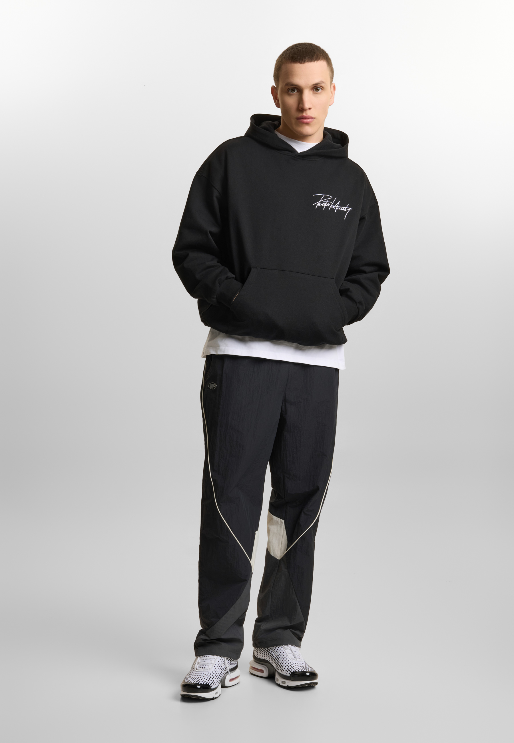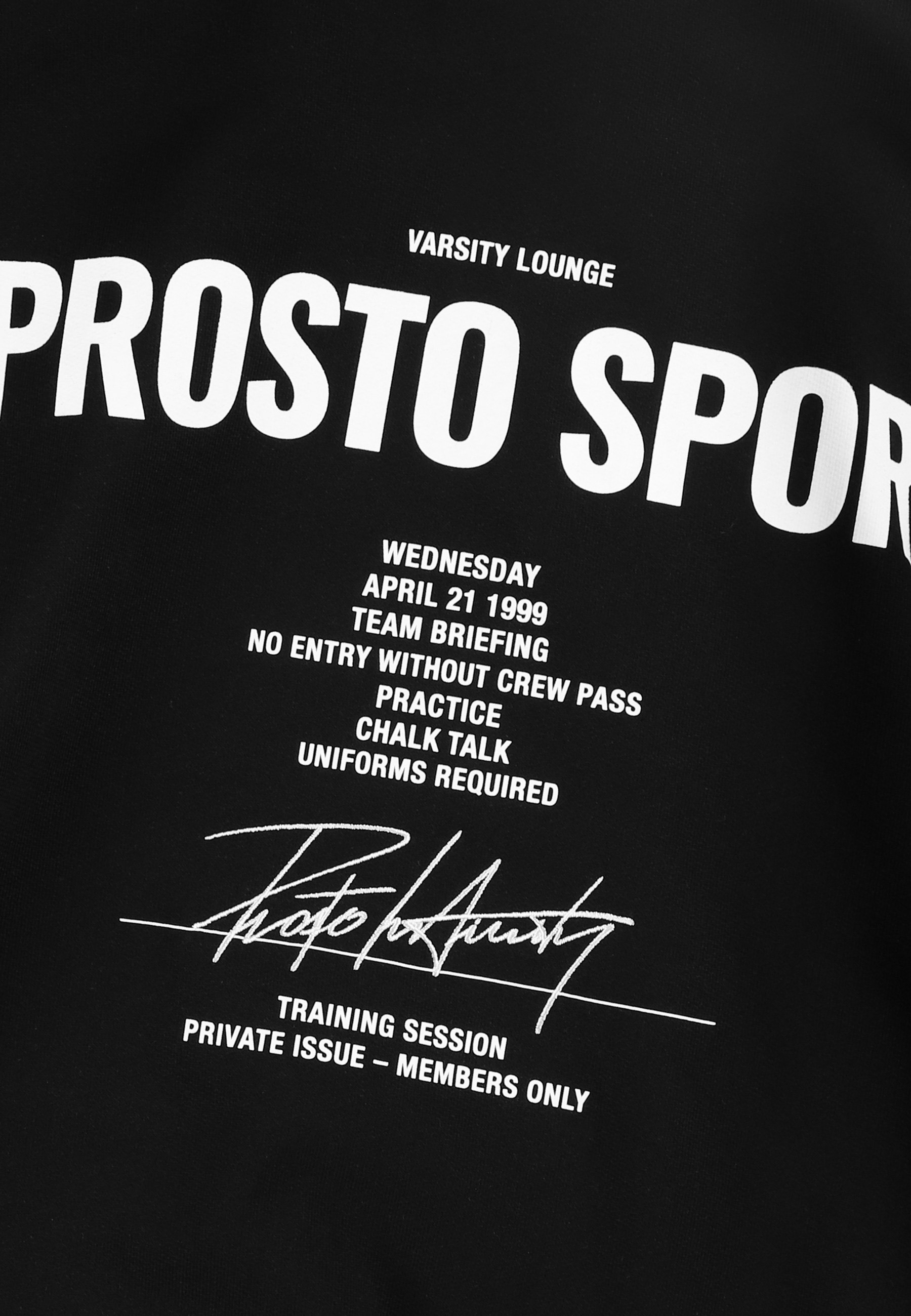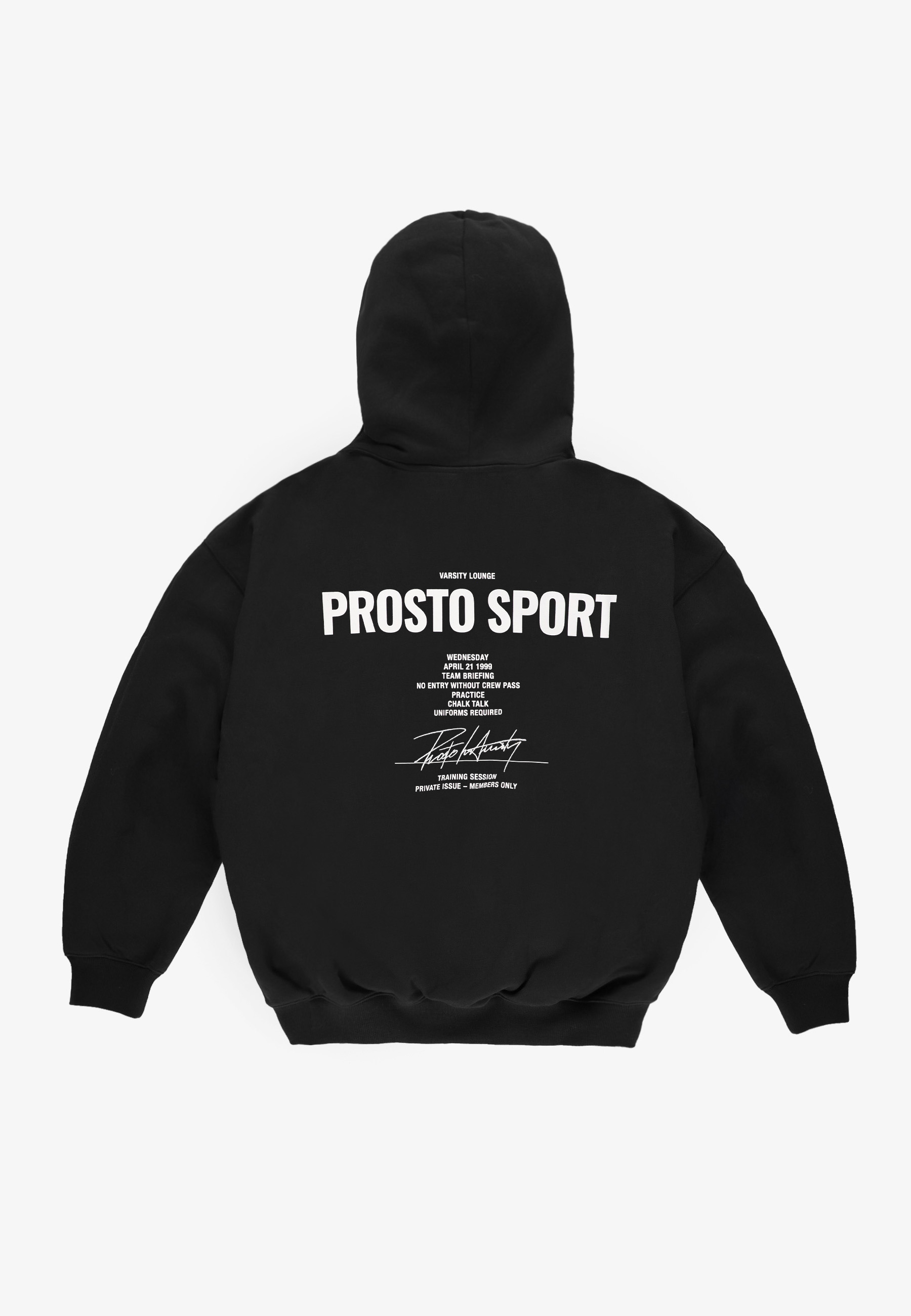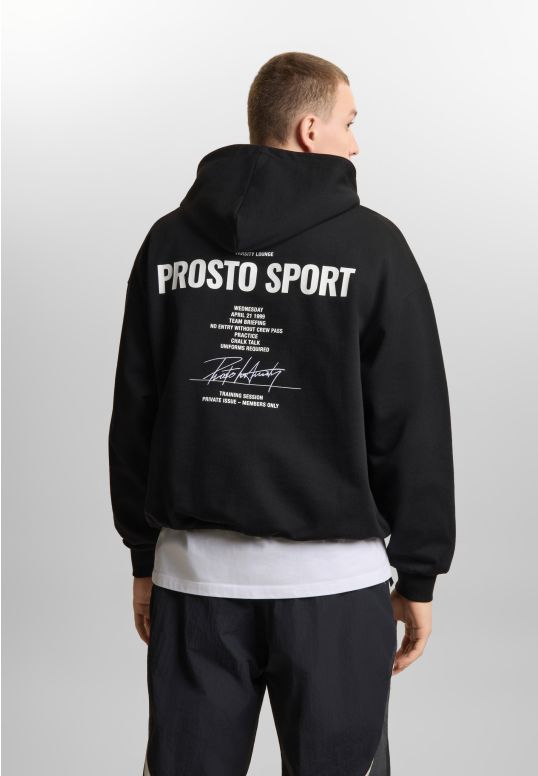 Bluza Hoodie Club Black - męska bluza z kolekcji Prosto inspirowana stylistyką klubowych treningów i sportowych grafik znanych z zaplecza drużyn oraz gymów lat 90. Oversize’owy krój nadaje jej nowoczesne proporcje i zapewnia maksymalny komfort noszenia. Czysta czarna baza została uzupełniona charakterystyczną grafiką Prosto Sport na plecach wykonaną w technice sitodruku plastisolowego, a z przodu pojawia się subtelny haft. To bluza, która dobrze działa w codziennych stylizacjach - na miasto, po treningu albo jako element wygodnego sportowego seta.