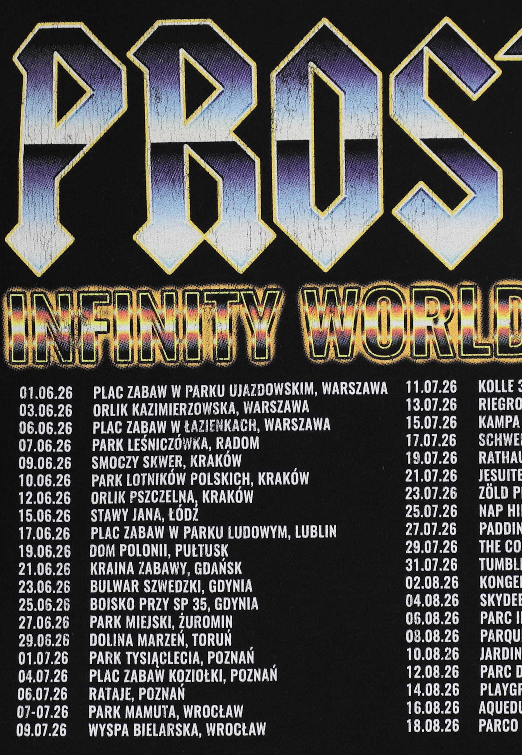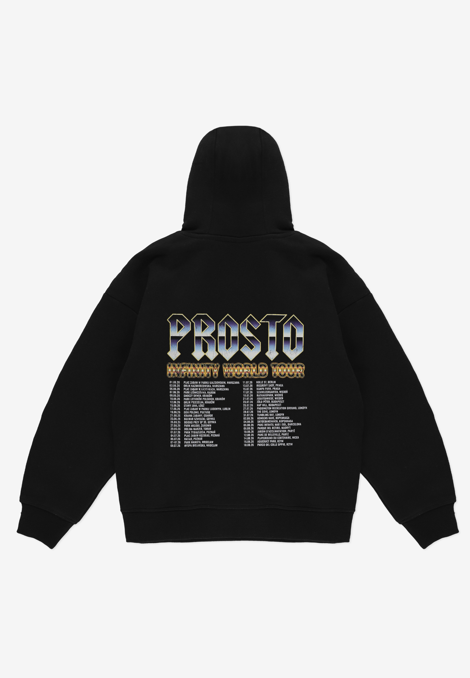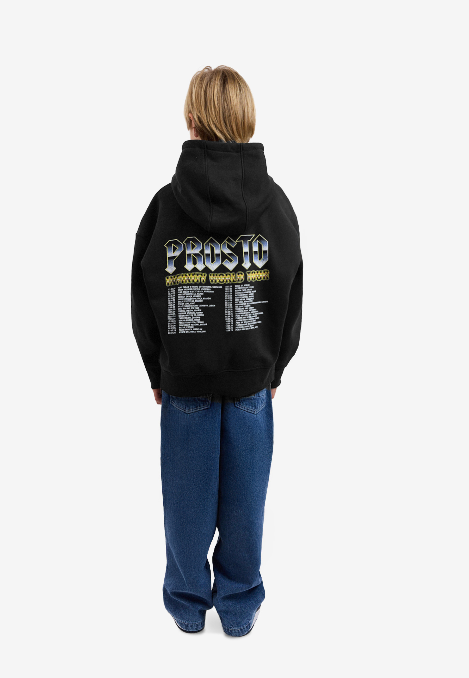 Hoodie Merch – dziecięca bluza z linii Prosto Kids, zaprojektowana w stylistyce koncertowych merchów. Model ma regularny krój i wykonany jest z miękkiej dzianiny fleece, dzięki czemu zapewnia wygodę i komfort przez cały dzień. Z przodu znajduje się niewielki nadruk Prosto, natomiast tył zdobi duża grafika w formie tour listy najlepszych miejsc do zabawy. To wyrazisty model, który idealnie wpisuje się w muzyczny charakter całego dropu.