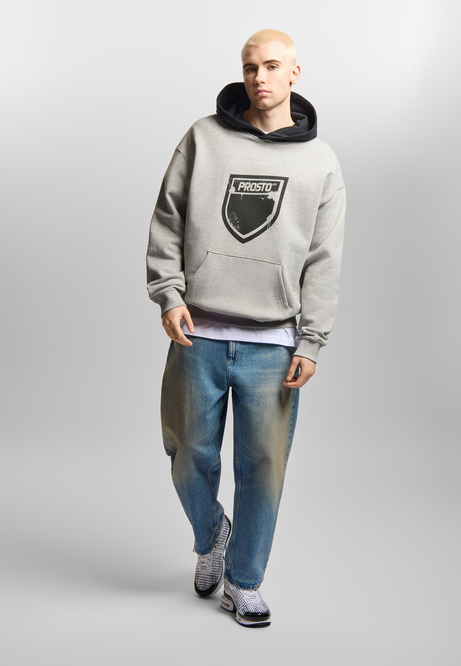 Bluza Hoodie Splash Shield Gray - męska bluza z kapturem Prosto z kontrastowym, czarnym kapturem. Na froncie pojawia się duża tarcza Prosto w wersji Splash Shield - klasyczne logo w surowej, lekko niedoskonałej interpretacji, która nadaje grafice bardziej streetowy charakter. Szara baza przełamana ciemnym kapturem buduje mocny kontrast i sprawia, że bluza zachowuje wyrazisty, miejski vibe. Klasyczna forma bluzy z kapturem i kieszenią typu kangurka daje wygodę na co dzień, a charakterystyczna grafika Prosto buduje stylizację jednym, czytelnym akcentem.