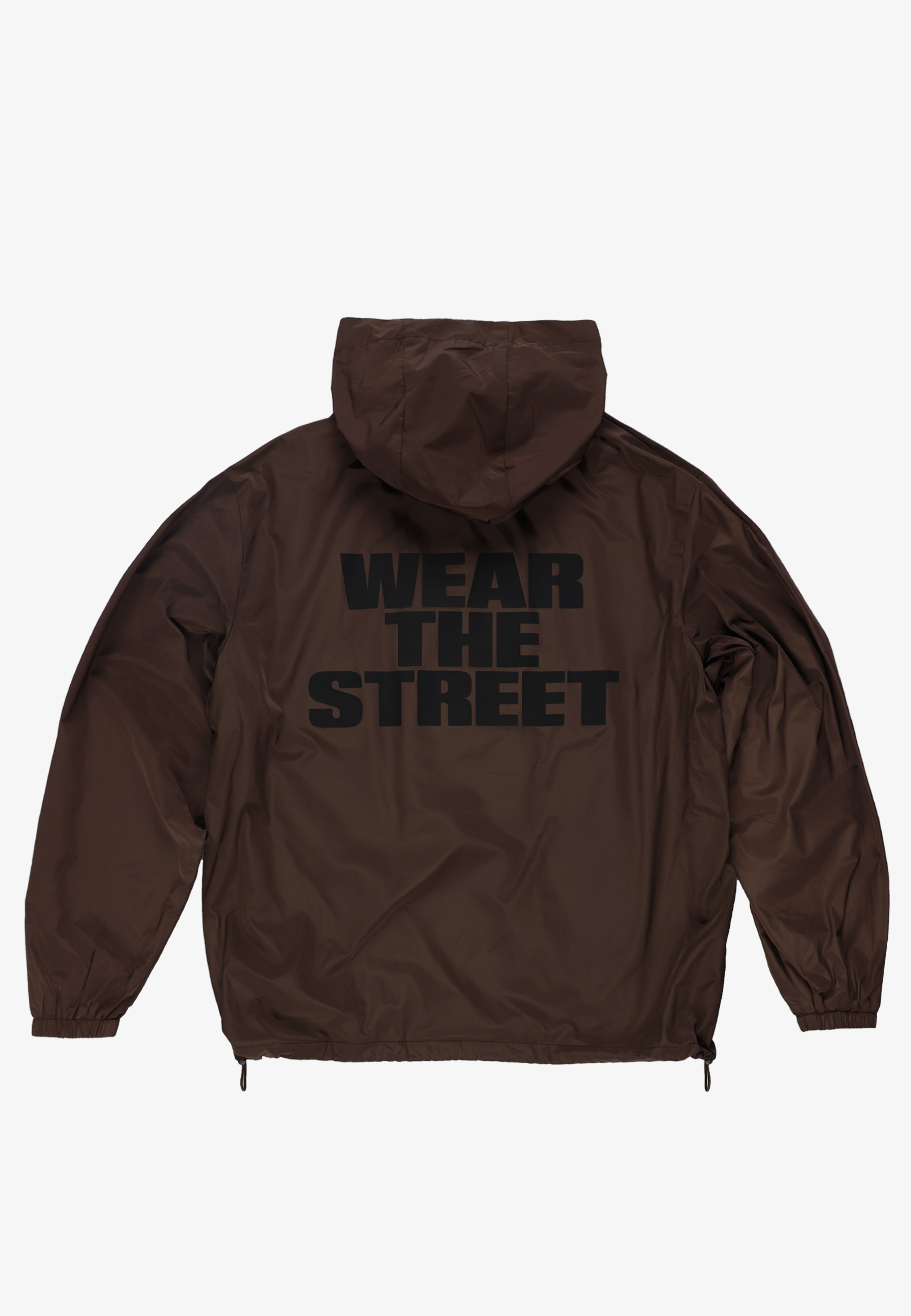 Jacket Rains Brown – męska kurtka z kolekcji Prosto w odcieniu brązu. Lekka, techniczna forma z kapturem i zapięciem na napy zapewnia szybkie zakładanie i swobodę ruchu, a prosta, czysta bryła sprawdzi się zarówno w codziennych stylizacjach, jak i w bardziej funkcjonalnych zestawach. Od środka model został wykończony miękkim polarem typu fleece, który zwiększa komfort noszenia i zapewnia dodatkowe ciepło w chłodniejsze dni. Na froncie znajduje się plastisolowy nadruk Prosto, a na plecach duży nadruk "Wear The Street", podkreślający charakter marki. Praktyczne kieszenie oraz wewnętrzna kieszeń zapinana na napę ułatwiają przechowywanie drobiazgów.