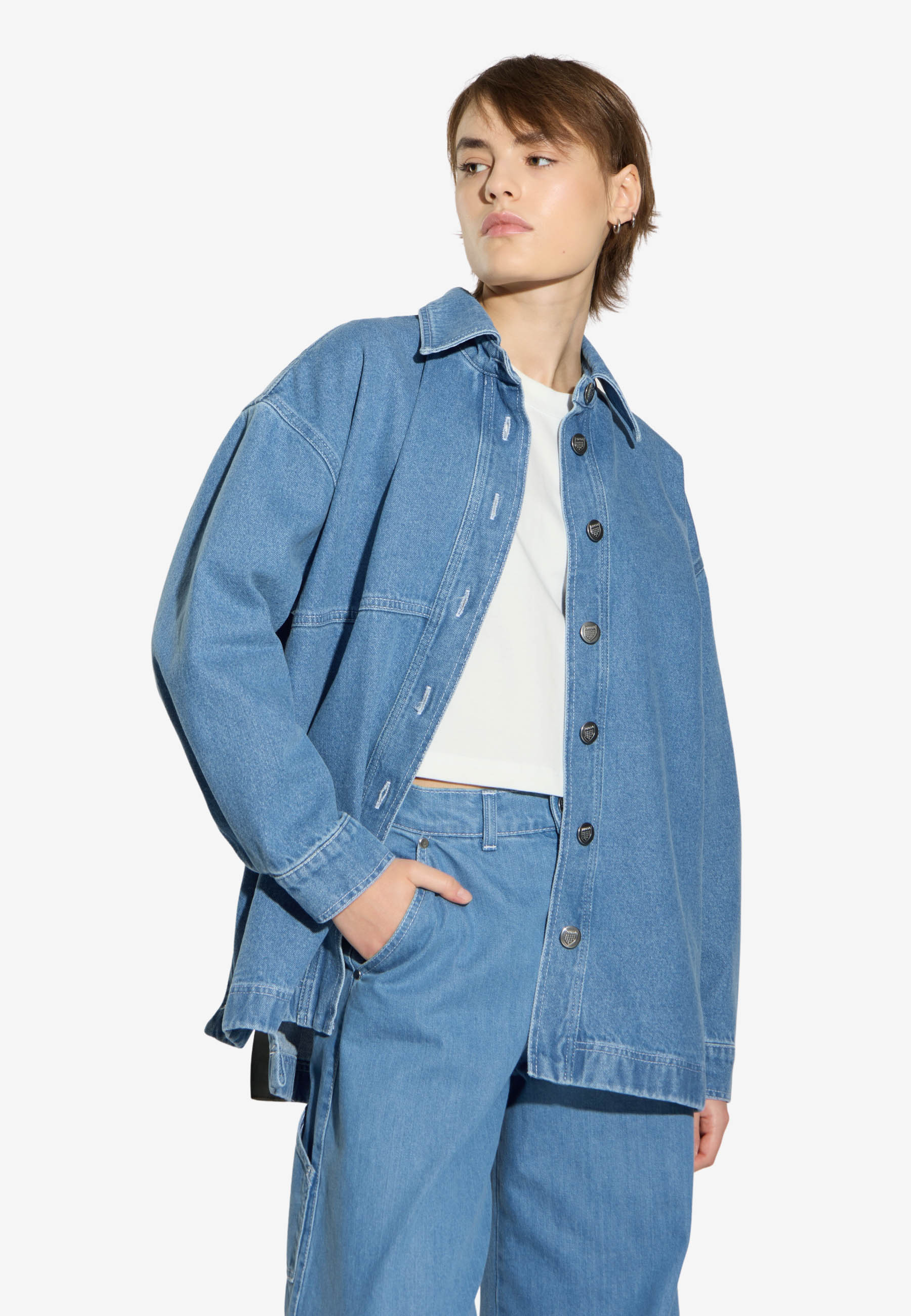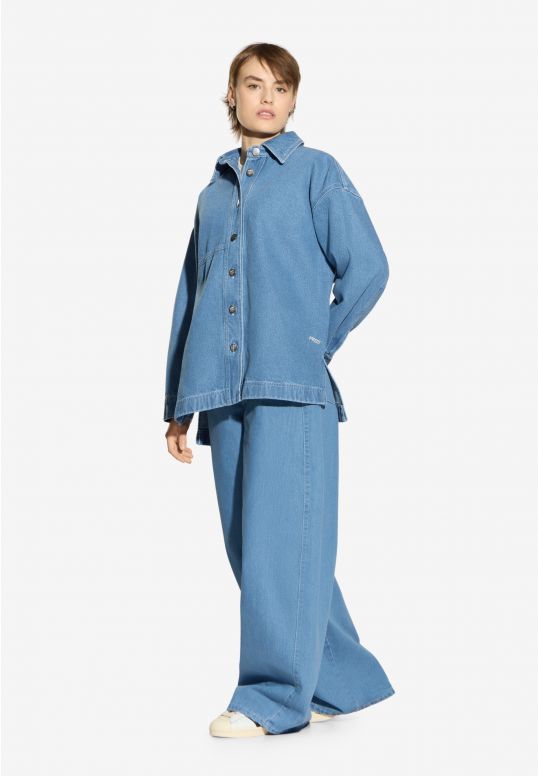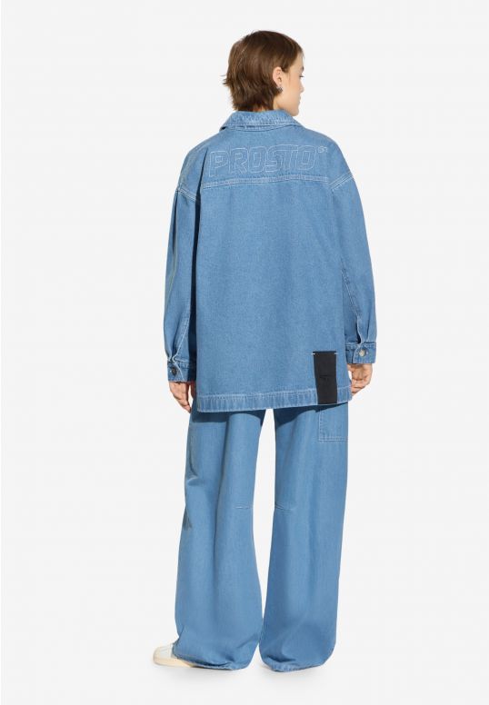 Long Shirt Work Light Blue – damska koszula jeansowa z kolekcji Prosto w kolorze jasnego denimu. Ma oversize’owy krój z lekko przedłużonym tyłem i rozcięciami po bokach, co nadaje jej swobodny, nowoczesny charakter. Wykonana w 100 % z bawełnianego denimu, który został poddany delikatnemu spraniu, dzięki czemu materiał jest miękki, przyjemny w dotyku i zachowuje klasyczną strukturę jeansu. Model ma nieco większy niż standardowy kołnierz, naszywaną kieszeń na piersi oraz metalowe guziki z logo. Z przodu znajduje się haft Prosto, a z tyłu – duża aplikacja z tym samym motywem. U dołu umieszczono czarną metkę z ekoskóry z tłoczonym logo. To uniwersalny model, który łączy funkcjonalność koszuli z charakterem jeansowej kurtki.