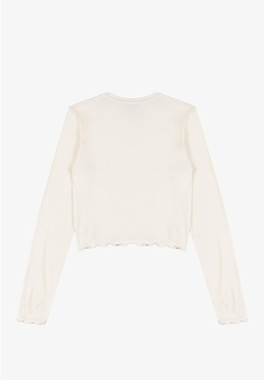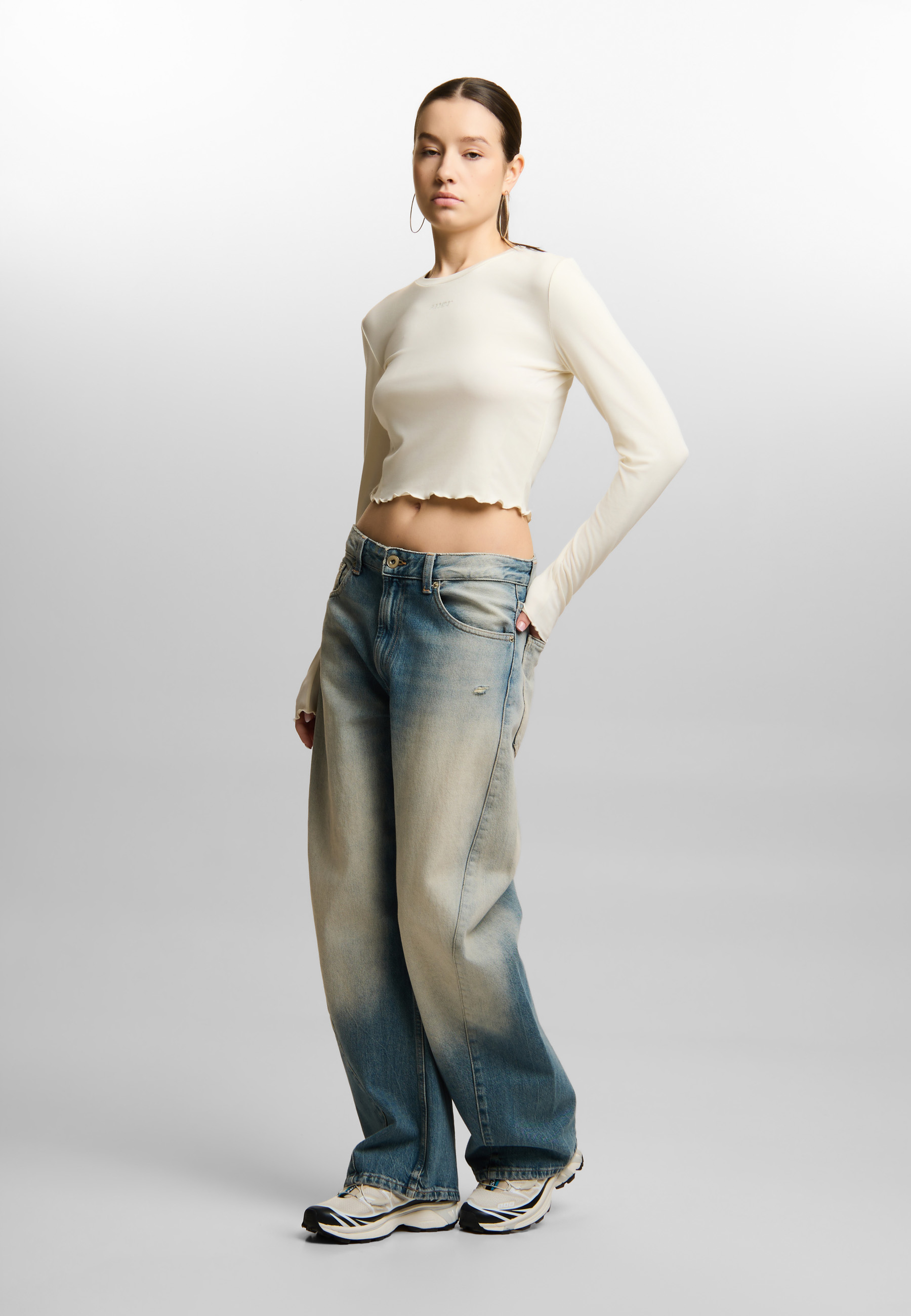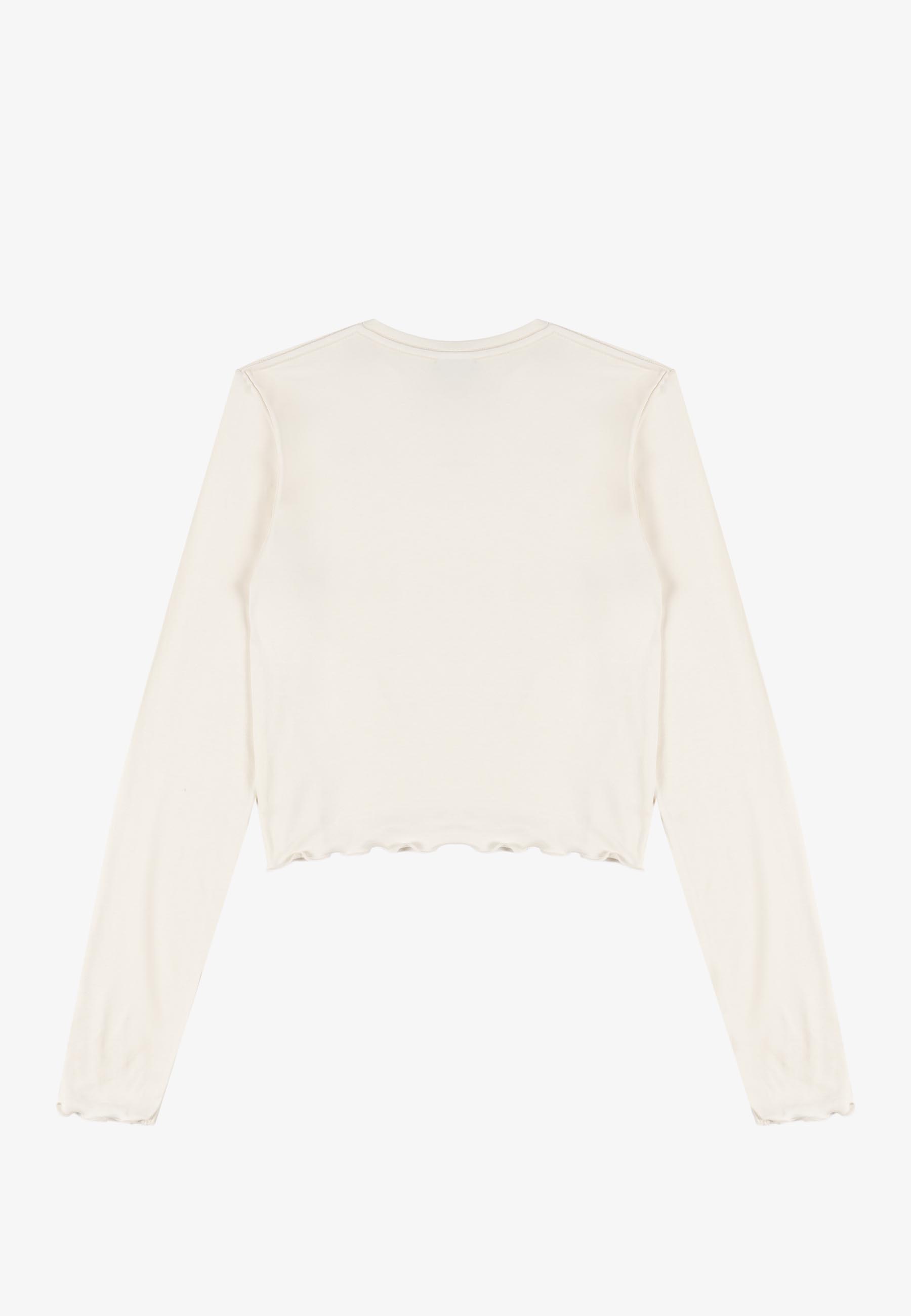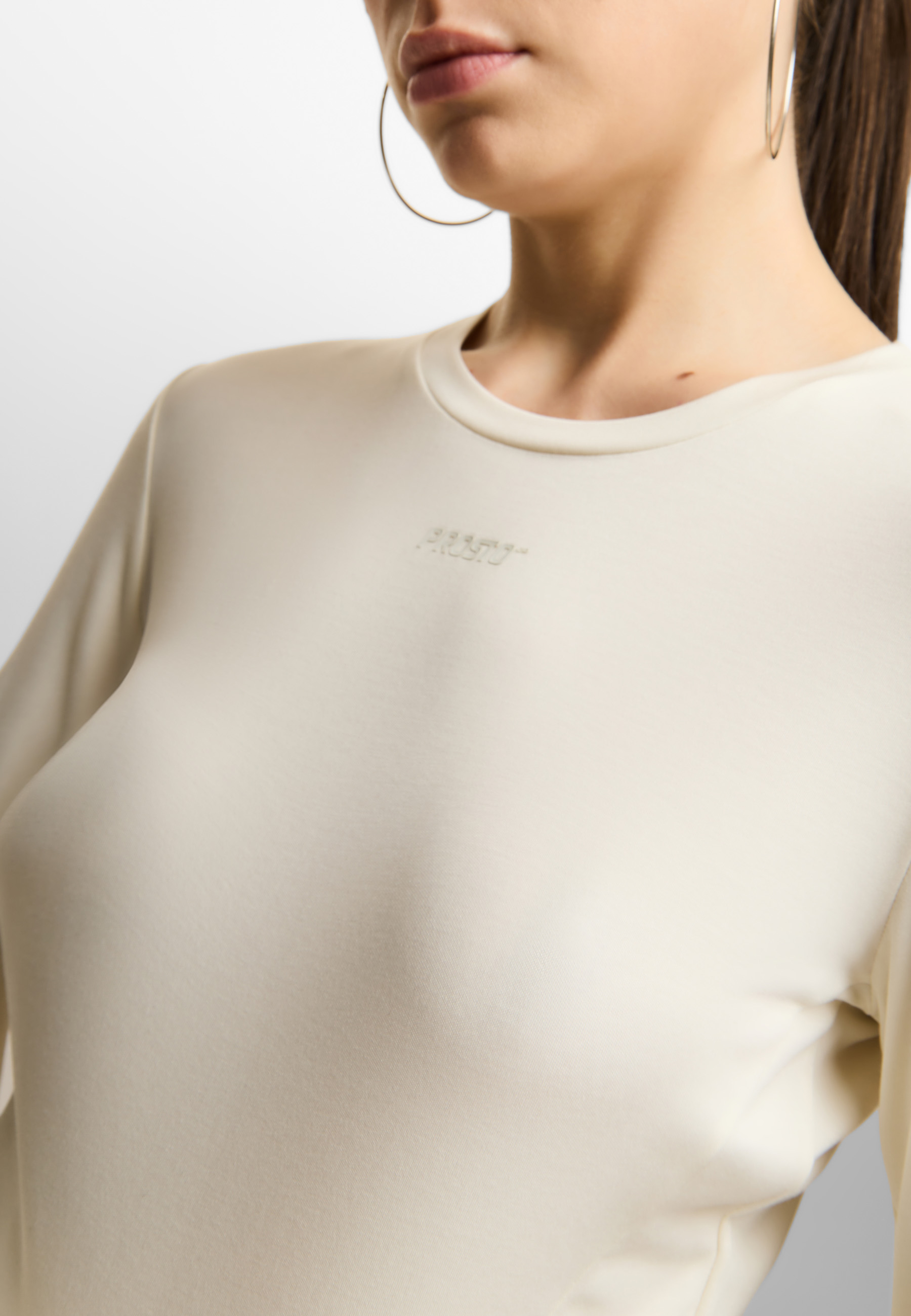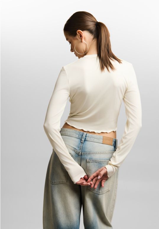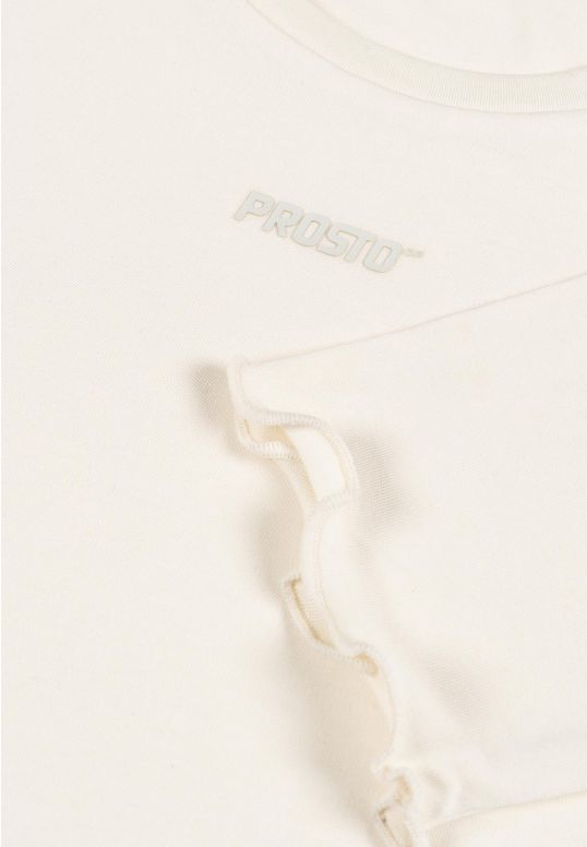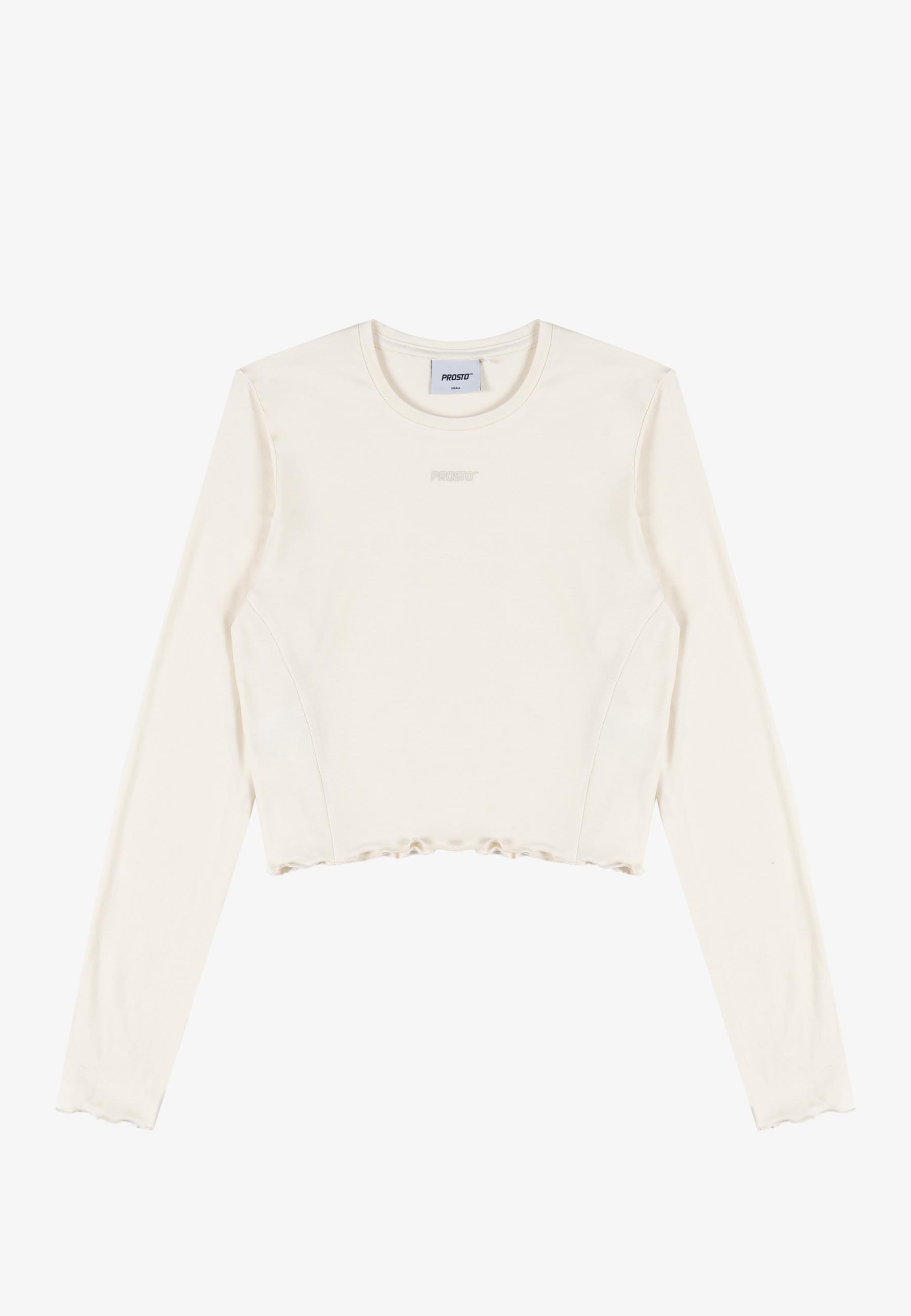 Longsleeve Slab Off-White - damski longsleeve Prosto, który na pierwszy rzut oka wygląda jak perfect basic, ale całą robotę robi tu forma i detal. To model, który możesz wystylizować na wiele sposobów - solo, warstwowo, bardziej clean albo bardziej edgy - i za każdym razem będzie wyglądał dobrze. Dopasowany krój, skrócona długość i subtelnie modelujące cięcia nadają sylwetce lekkości, a delikatne wykończenie przy rękawach i dole dodaje całości bardziej kobiecego, dopracowanego charakteru. To jeden z tych elementów, które nie dominują całego looku, ale z nim współpracują.