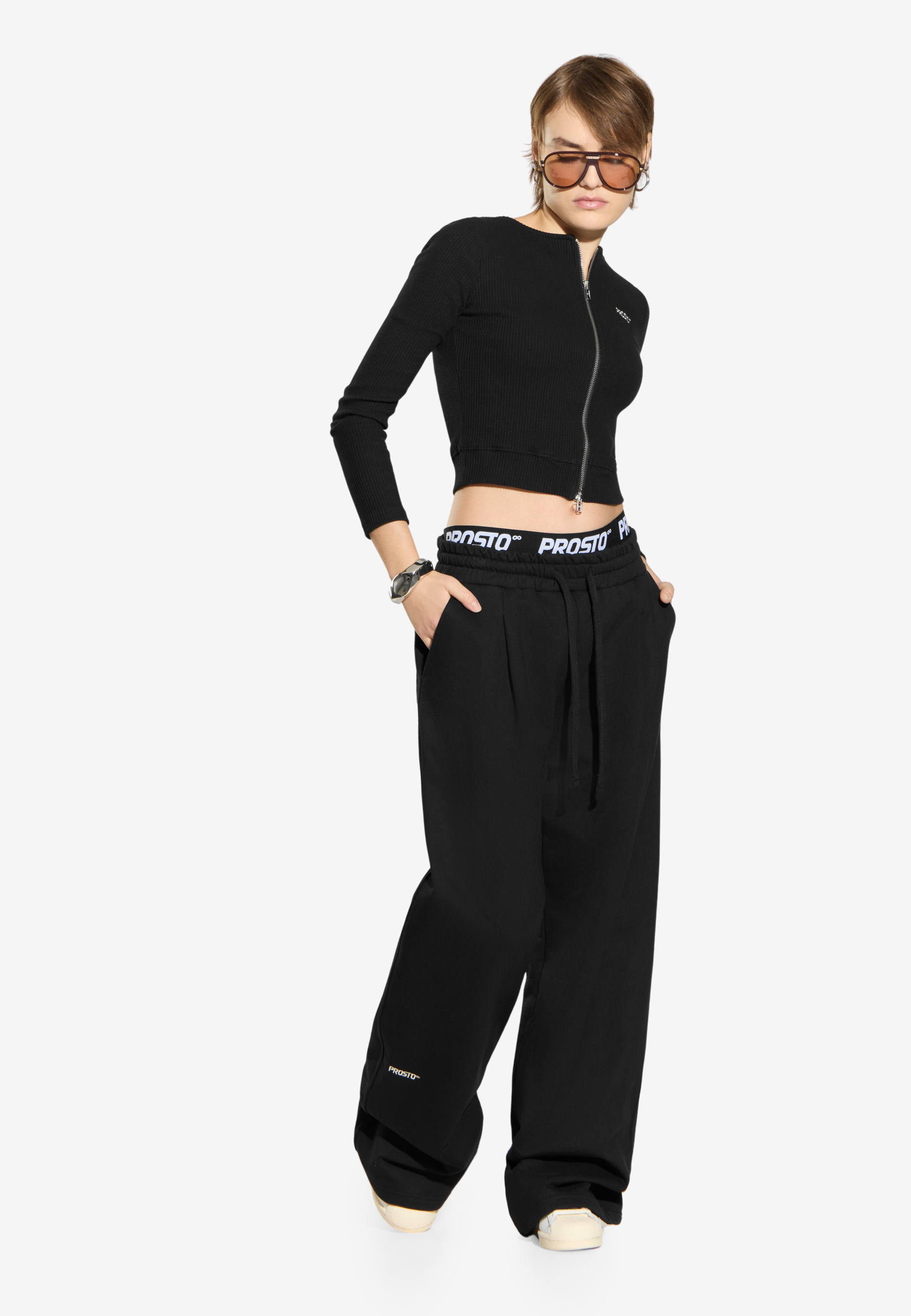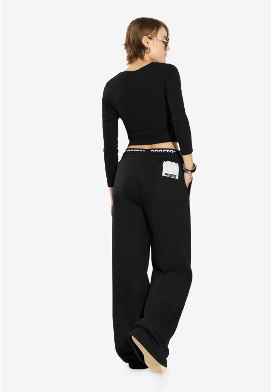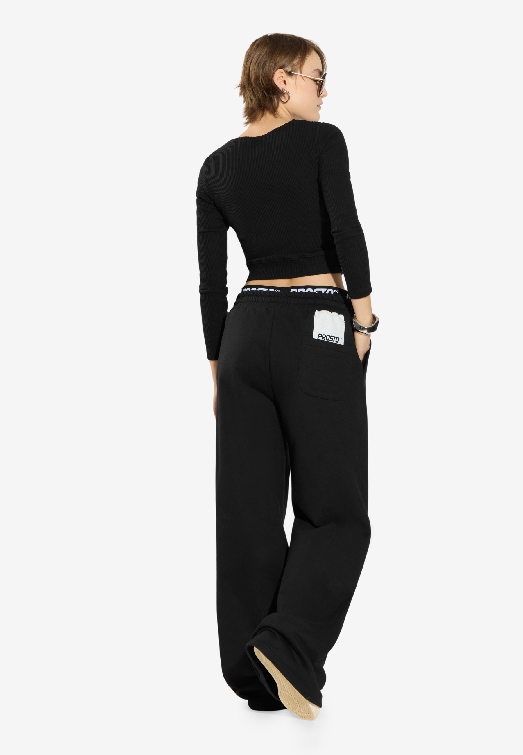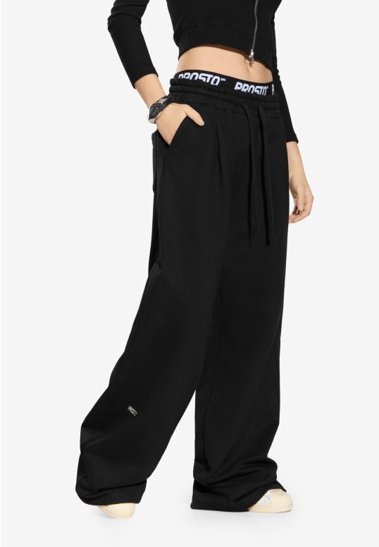 Pants Oversized Black – damskie spodnie dresowe z kolekcji Prosto w klasycznym, czarnym kolorze. Mają luźny, oversize’owy krój z szeroką nogawką, który zapewnia swobodę i nowoczesny wygląd. W pasie wszyta jest szeroka guma z płaskim sznurkiem do regulacji, dzięki czemu spodnie dobrze leżą i nie tracą formy. Wykonane z grubej bawełny typu pętelka – materiał jest miękki, solidny i przyjemny w noszeniu. Haft z logo Prosto na nogawce i nadruk z tyłu wykonany metodą sita wodnego dopełniają minimalistyczny, streetowy design. Idealne solo albo w komplecie z hoodie lub crewneckiem z tej samej linii.
