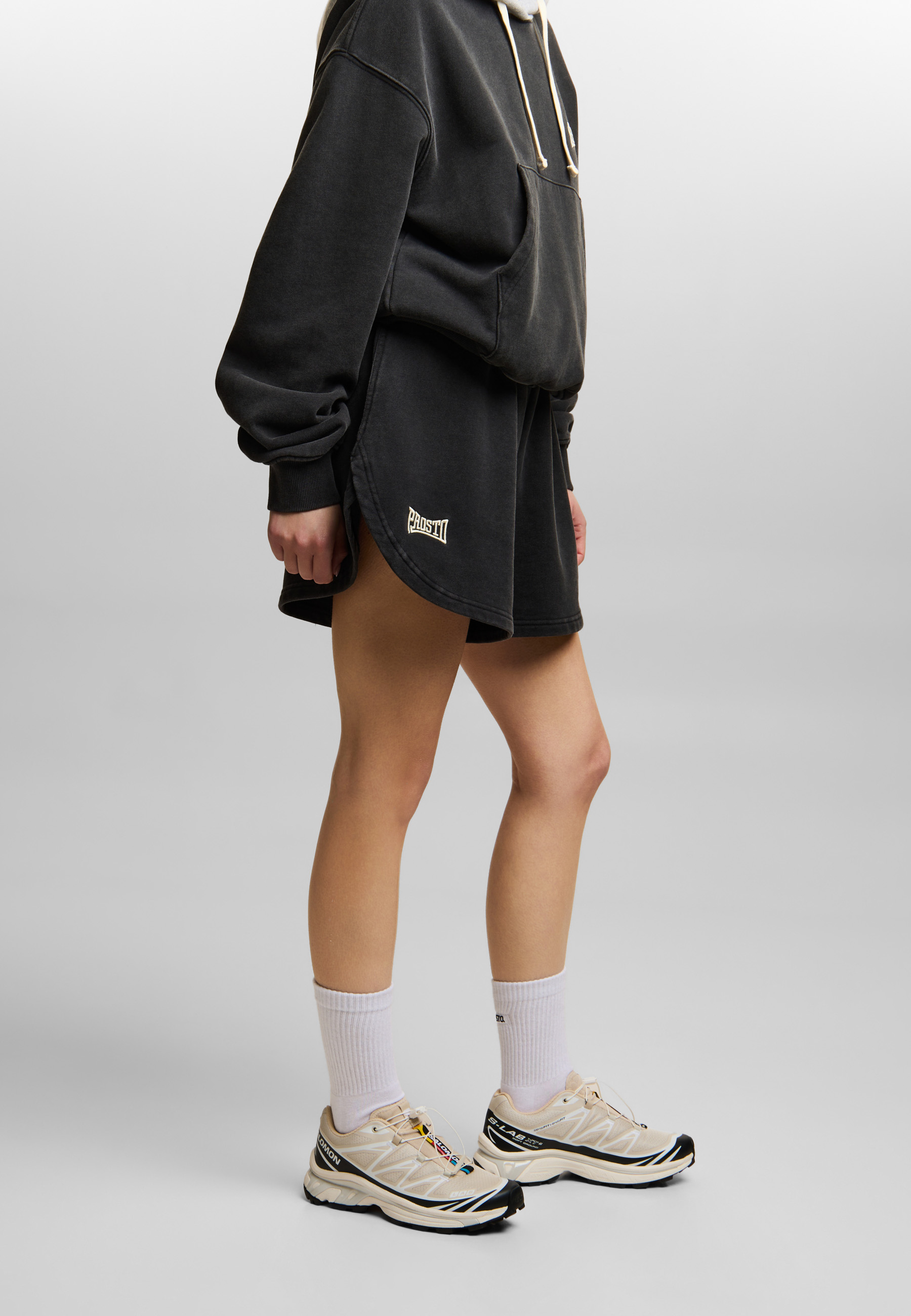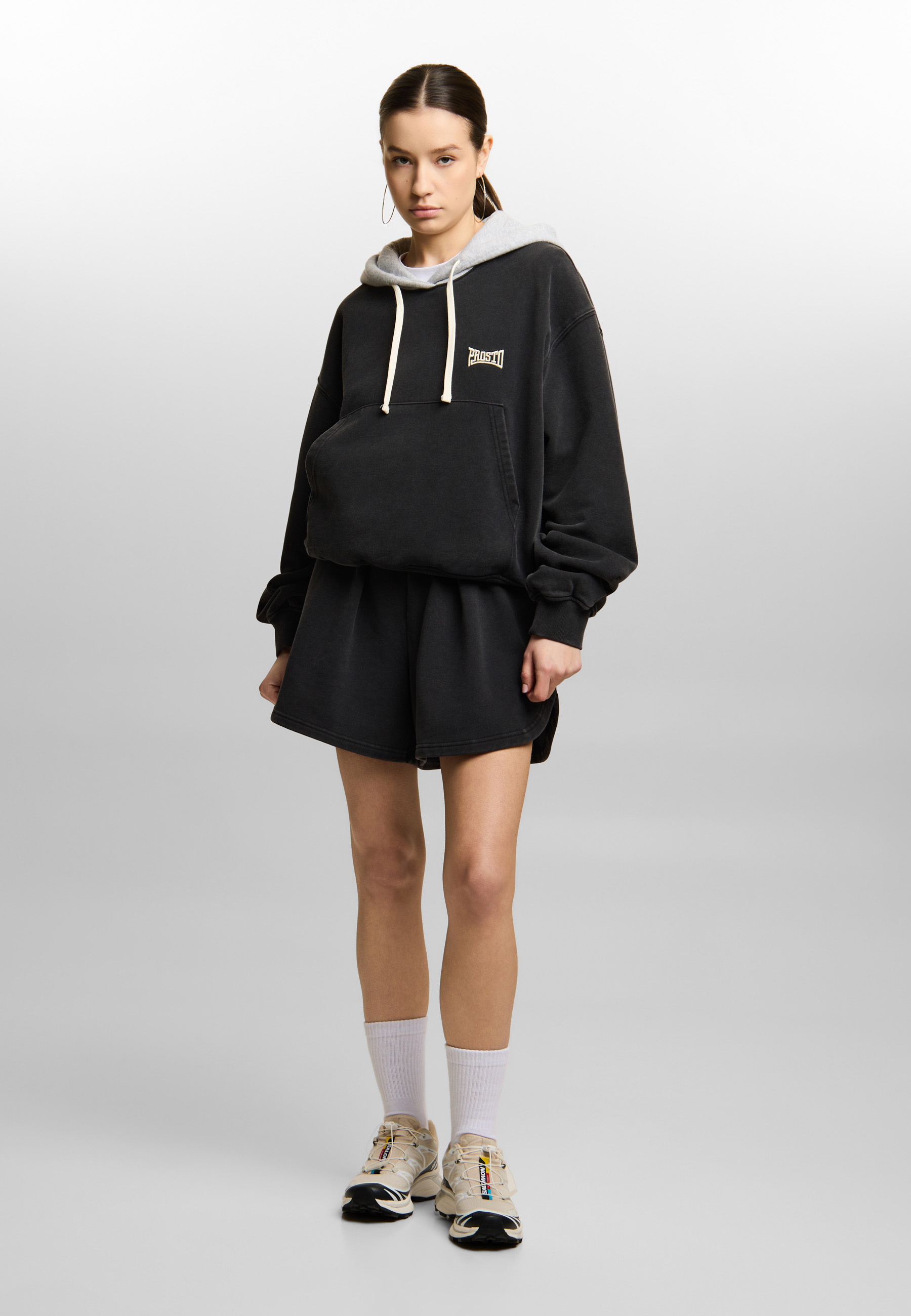 Szorty zostały wykonane z grubej bawełnianej dzianiny french terry o gramaturze 450 g/m², dzięki czemu dobrze trzymają fason i układają się dokładnie tak, jak powinny. Elastyczny pas ze sznurkiem, delikatny haft Prosto, modelujące zaszewki i boczne wycięcia budują całość, która wygląda lekko, ale bardzo świadomie. To fason, który sam robi sylwetkę i spokojnie może być najmocniejszym elementem całego letniego looku.