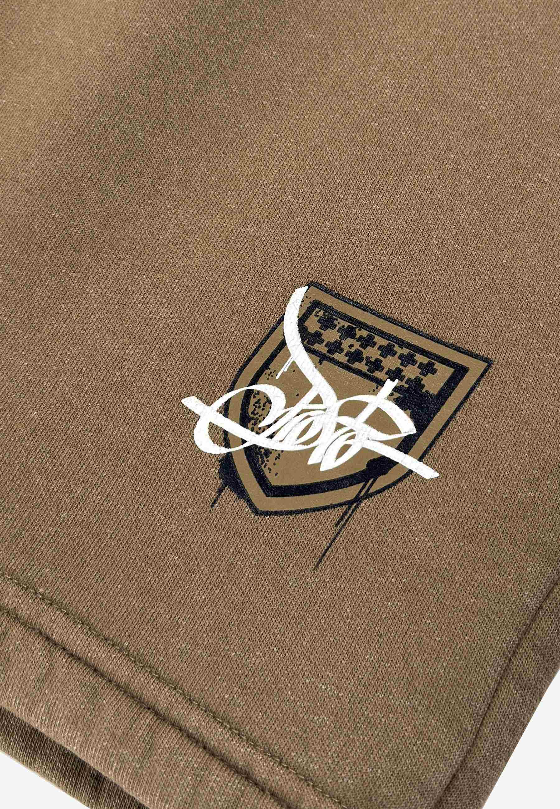 Sweat Shorts Damage Target Washed Cinnamon Beige - męskie spodenki dresowe Prosto w odcieniu washed cinnamon beige. Sprany, ciepły beż nadaje im nowoczesny streetwearowy charakter, a całość dopełnia grafika tarczy Prosto w wersji Damage Target. Motyw wygląda jak znak pozostawiony w ruchu - lekko naruszony, warstwowy i celowo niedoskonały, dzięki czemu projekt zachowuje surowy, autentyczny vibe. Luźniejszy, baggy krój daje komfort i swobodę noszenia, a elastyczny pas ze sznurkiem pozwala łatwo dopasować spodenki do sylwetki. To model, który dobrze odnajduje się w letnich fitach - od prostych miejskich zestawów po bardziej dopracowane streetowe stylizacje.