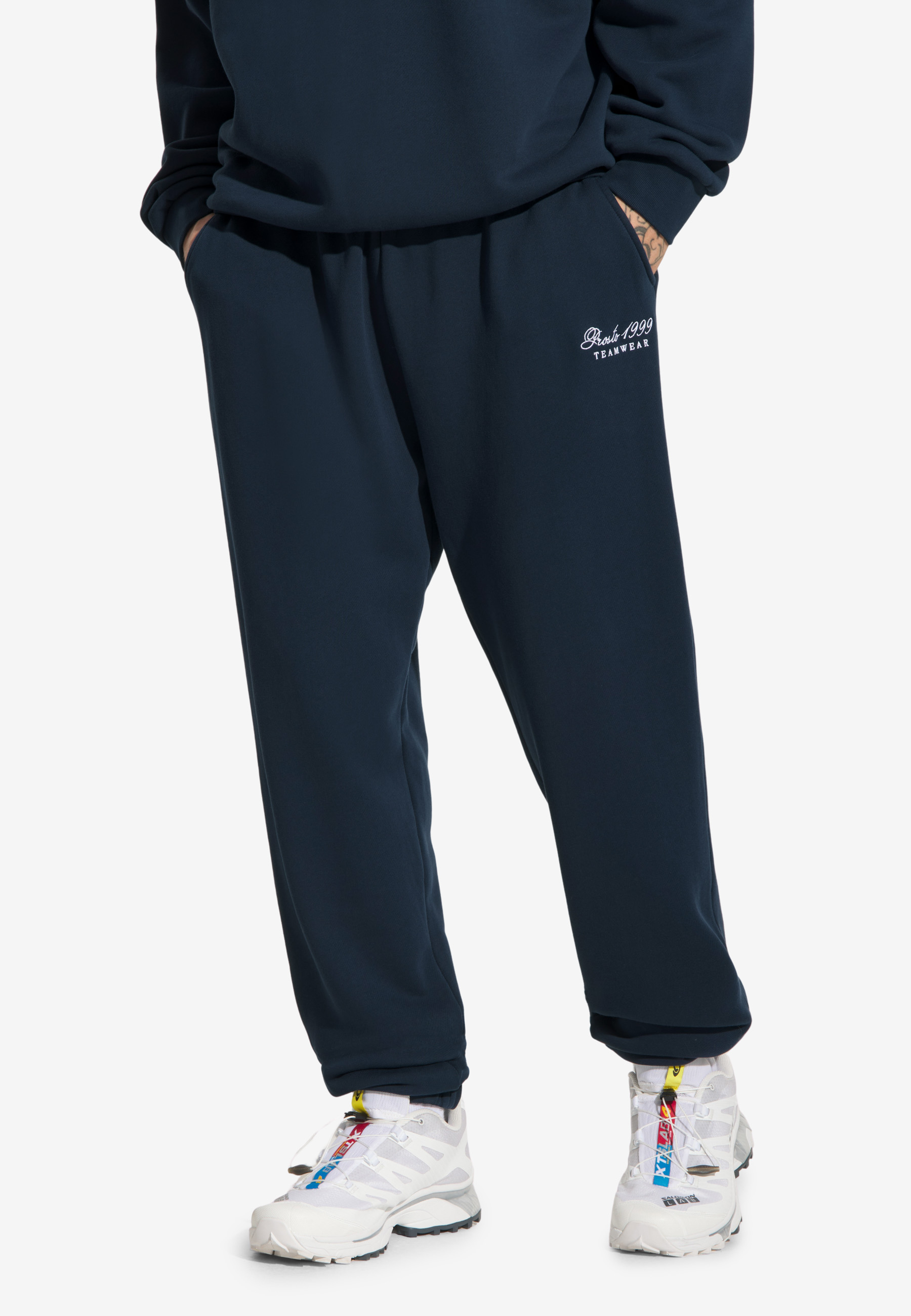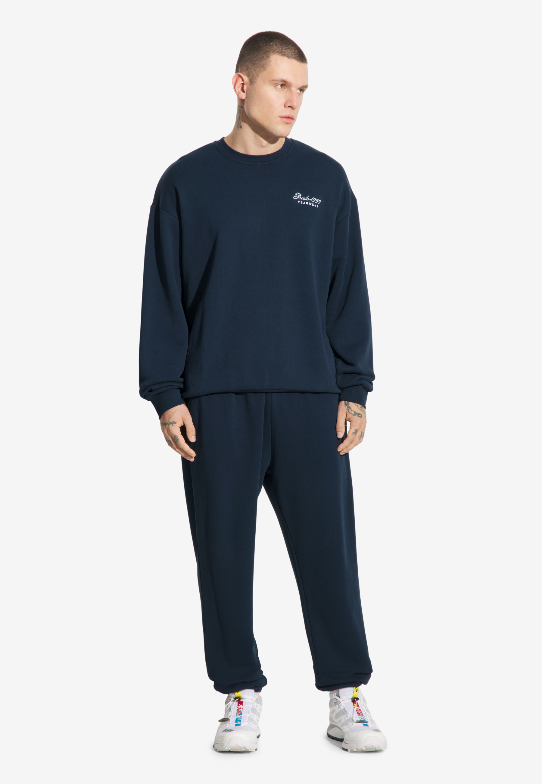 Sweatpants Football Navy – klasyka streetwearu w codziennym wydaniu. Te spodnie łączą wygodę z uniwersalnym stylem – uszyte z grubej bawełny o diagonalnym splocie, trzymają formę i zapewniają pełen komfort. Głęboki granat sprawia, że łatwo je zestawić z każdym outfitem – od bluzy po T-shirt. Regularny krój, elastyczna guma w pasie i sznurek do regulacji gwarantują idealne dopasowanie, a haftowane logo dodaje charakteru i podkreśla, że jesteś w drużynie Prosto.