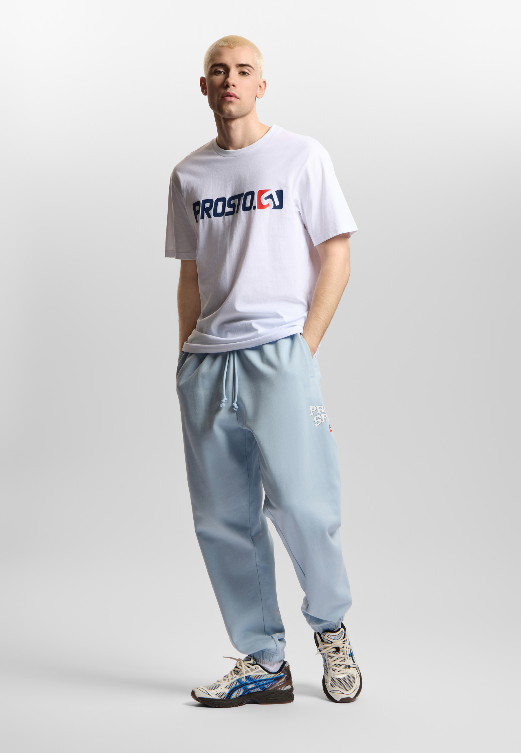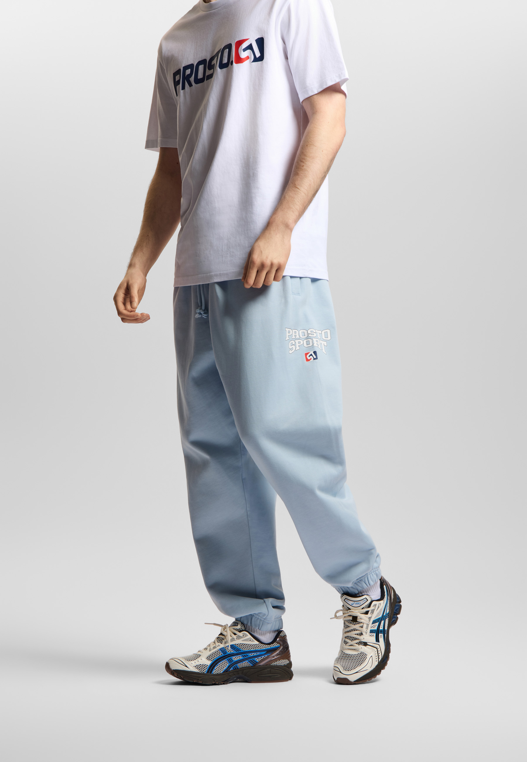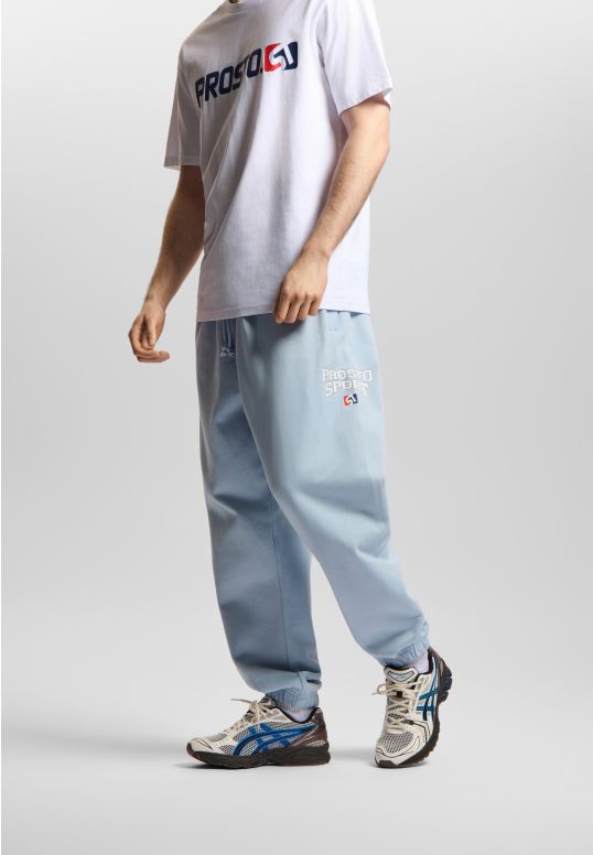 Spodnie Sweatpants Harvard Light Blue - męskie spodnie dresowe o kroju oversize w jaśniejszej odsłonie. Jasnoniebieska baza nadaje im lekkości, ale zachowuje sportowy charakter. Nadruk Prosto Sport to bezpośrednie nawiązanie do archiwalnej linii Prosto - projektu inspirowanego estetyką drużynową i akademicką typografią. 360 g bawełny z wykończeniem silicone wash daje miękkość i odpowiednią strukturę, dzięki czemu spodnie dobrze układają się na sylwetce. To model, który wygląda jak element uniformu - gotowy na codzienny set w wersji solo lub z bluzą do kompletu.