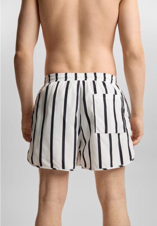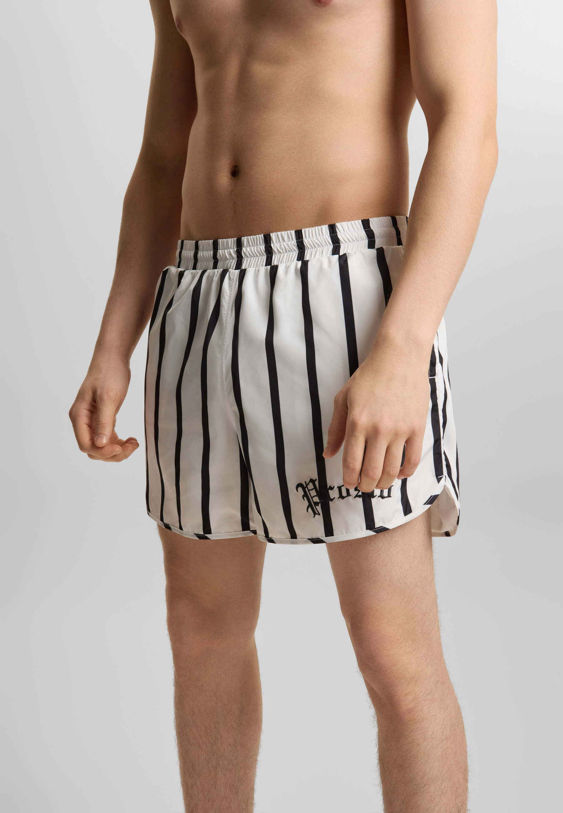 Szorty Swim Shorts College White - klasyczne męskie białe szorty kąpielowe Prosto z kontrastowymi czarnymi paskami. Minimalistyczna forma i logotyp Prosto w gotyckim stylu nadają im wyrazisty, sportowy charakter, który sprawdzi się zarówno na plaży, jak i w miejskim secie latem. Regularny krój zapewnia wygodę. Lekki, szybkoschnący materiał zapewnia komfort w letnie dni. Elastyczny pas z wewnętrznym sznurkiem umożliwia indywidualne dopasowanie, a siateczkowa podszewka zwiększa wygodę użytkowania. Model został dopracowany w detalach - boczne kieszenie zapewniają funkcjonalność na co dzień, z tyłu znajduje się dodatkowa kieszeń. Nogawki wykończone są delikatnymi rozcięciami po bokach, które poprawiają swobodę ruchu. Wzmocnienia w newralgicznych miejscach zwiększają trwałość konstrukcji. To model, który łączy funkcjonalność z wyraźnym, ale czystym brandingiem.