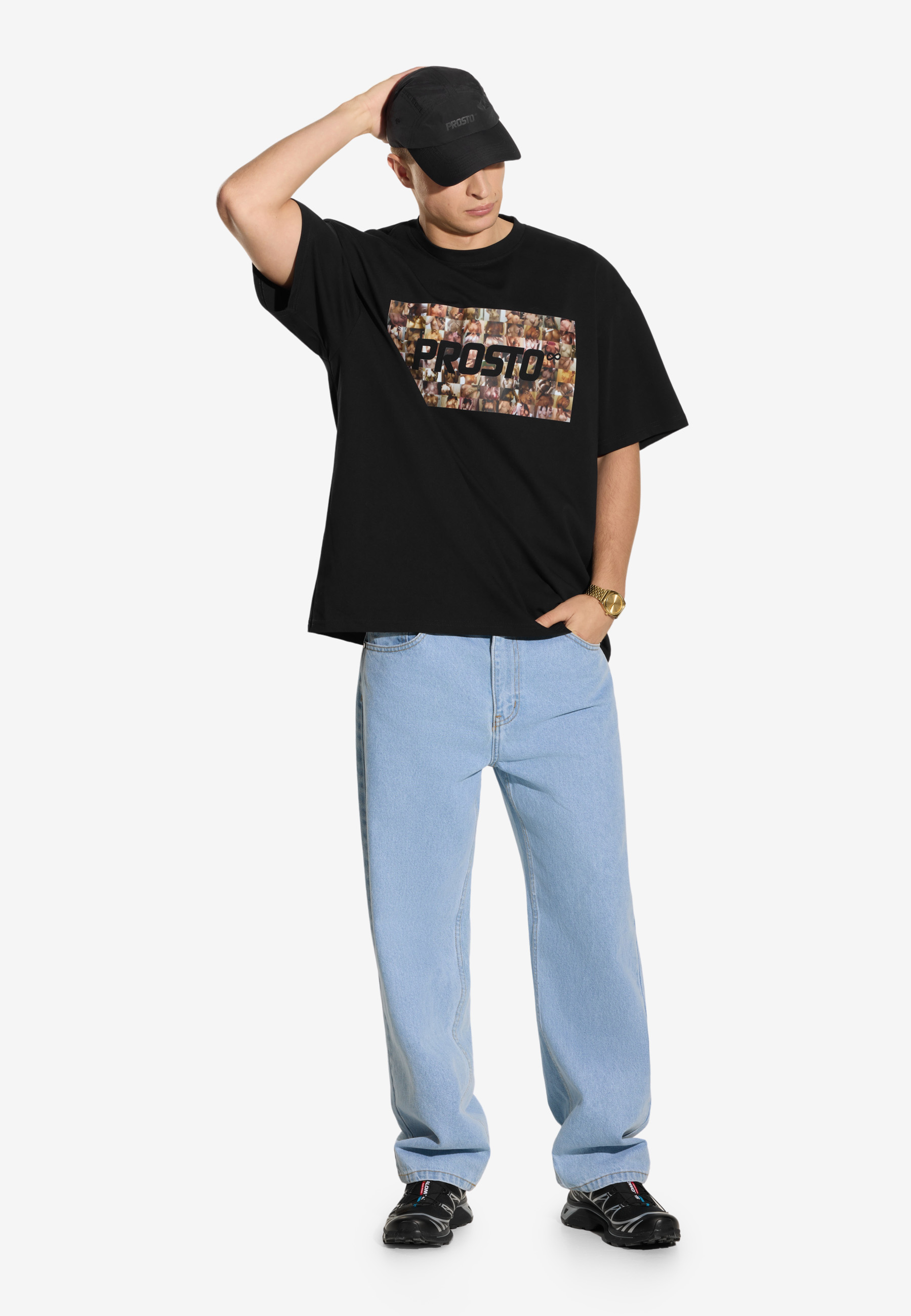 T-shirt Cams Black – męska koszulka z kolekcji Prosto Not Safe For Work (NSFW). Nadruk na froncie to kolaż złożony z rozmazanych, pikselowych kadrów pochodzących z kamerek internetowych – prowokacyjny, ale utrzymany w artystycznej, konceptualnej formie. Edgy motyw kontrastuje z minimalistycznym krojem i klasyczną czernią, tworząc mocny, wizualny statement. To projekt balansujący na granicy sztuki i kontrowersji, wpisujący się w estetykę NSFW i archiwalne DNA marki.