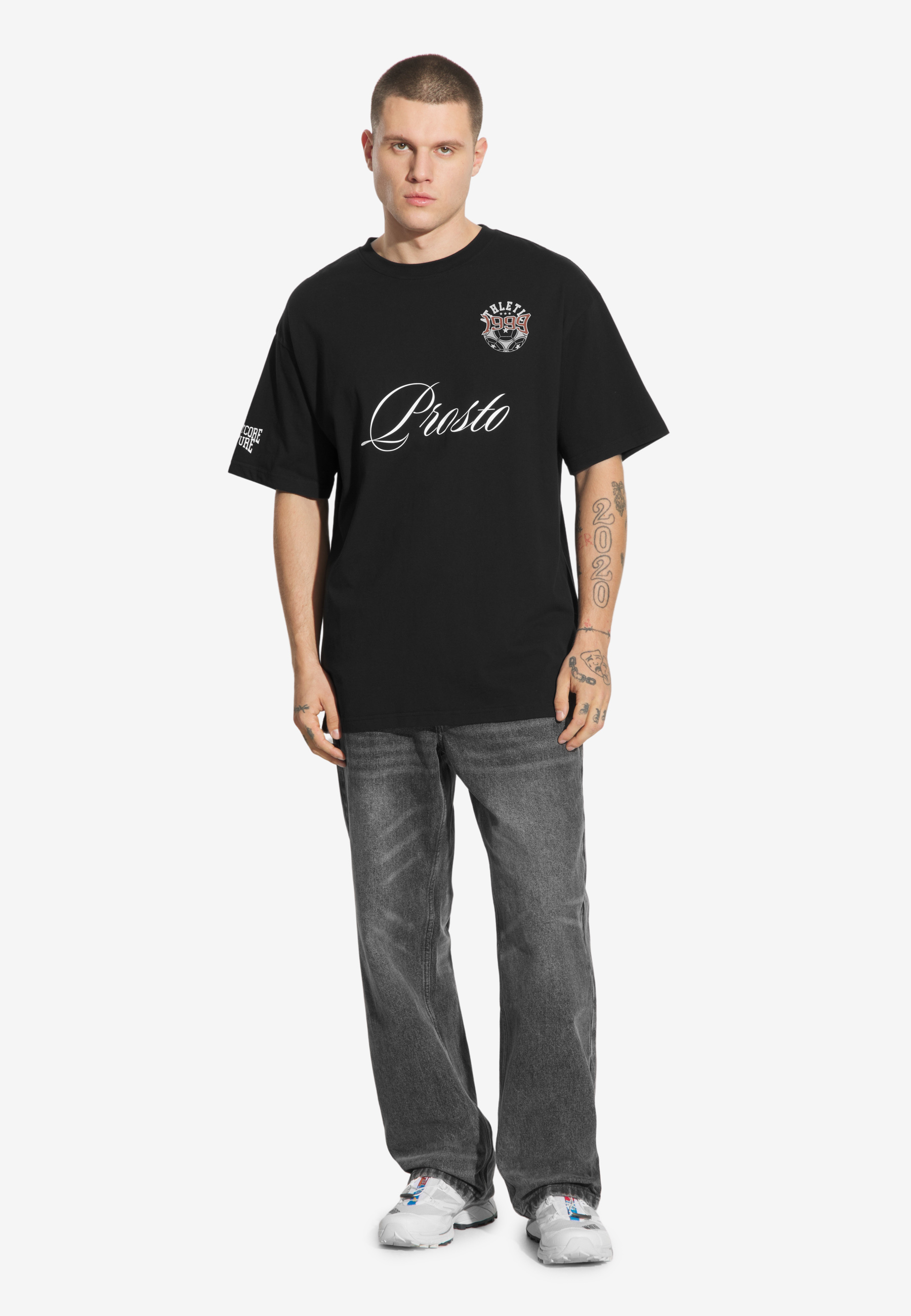 T-shirt Football Fan Washed Black – oversizowy T-shirt, który łączy luz z inspiracją sportowym stylem. Wykonany w 100% z miękkiej bawełny, przeszedł proces sprania washed, nadający mu lekko vintage’owego klimatu. Na piersi duże logo Prosto w wersji handwritten, a na rękawku i w górnej części klatki nadruki inspirowane koszulkami sportowymi. Idealny wybór na co dzień – od miejskich spacerów po stadionowe emocje.