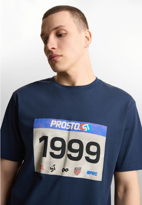 T-shirt Runner Navy - granatowa męska koszulka z kolekcji Prosto, która wygląda jak Twoja “naklejka startowa", tylko że bez zadyszki. Na froncie nadruk wodny inspirowany numerem biegowym z rokiem 1999 i pakietem znaków marki. Model o kroju regular fit, wykonany z bawełny single jersey (100% bawełna, 180 g/m²), co zapewnia komfort i lekkość w codziennym użytkowaniu. Grafika robi robotę zarówno na co dzień, jak i wtedy, gdy po prostu chcesz wyglądać jak ktoś, kto ma plan (nawet jeśli plan to tylko kawa).
