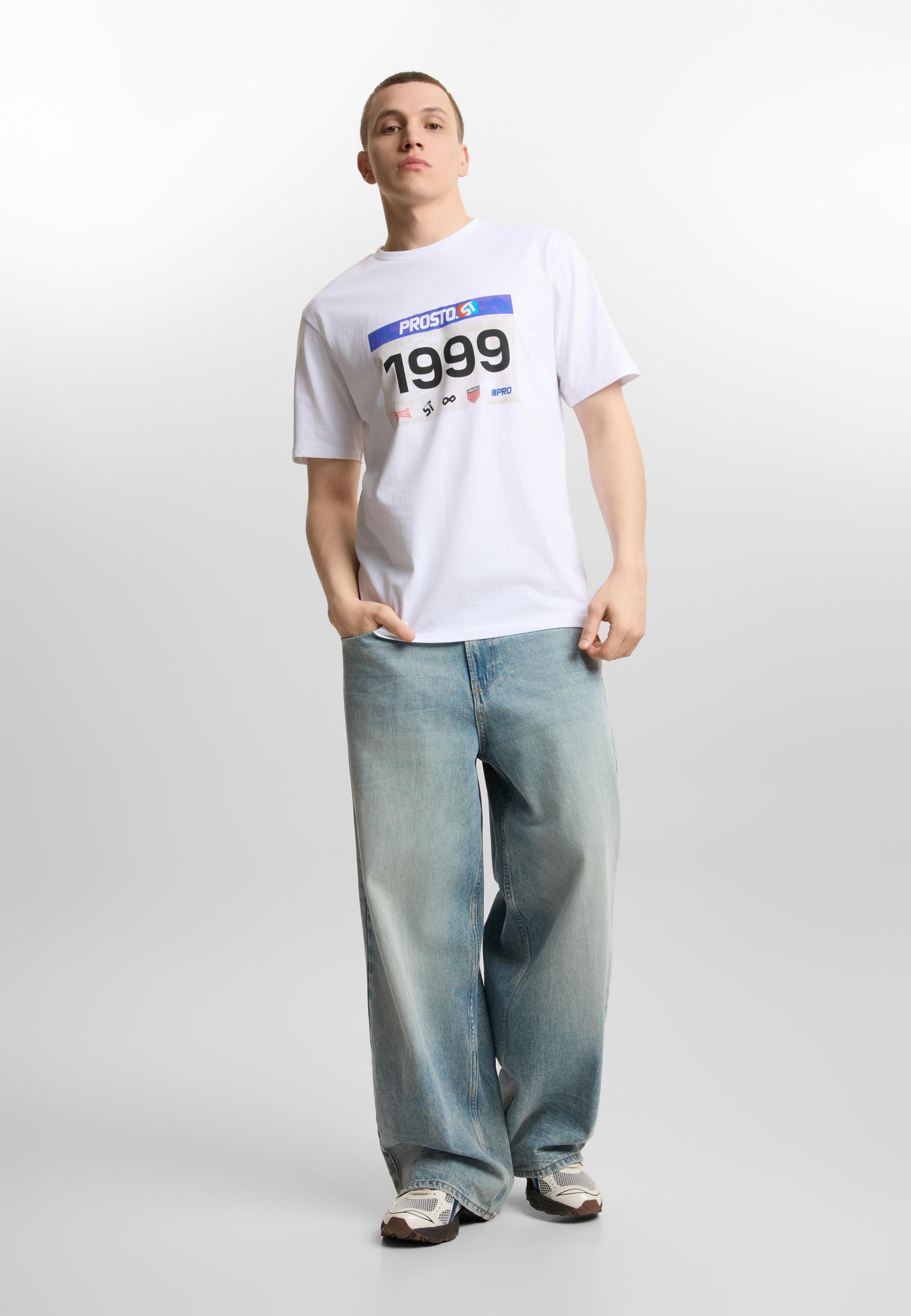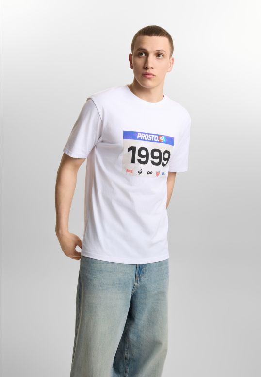 T-shirt Runner White - granatowa męska koszulka z kolekcji Prosto, która wygląda jak Twoja “naklejka startowa", tylko że bez zadyszki. Na froncie nadruk wodny inspirowany numerem biegowym z rokiem 1999 i pakietem znaków marki. Model o kroju regular fit, wykonany z bawełny single jersey (100% bawełna, 180 g/m²), co zapewnia komfort i lekkość w codziennym użytkowaniu. Grafika robi robotę zarówno na co dzień, jak i wtedy, gdy po prostu chcesz wyglądać jak ktoś, kto ma plan (nawet jeśli plan to tylko kawa).