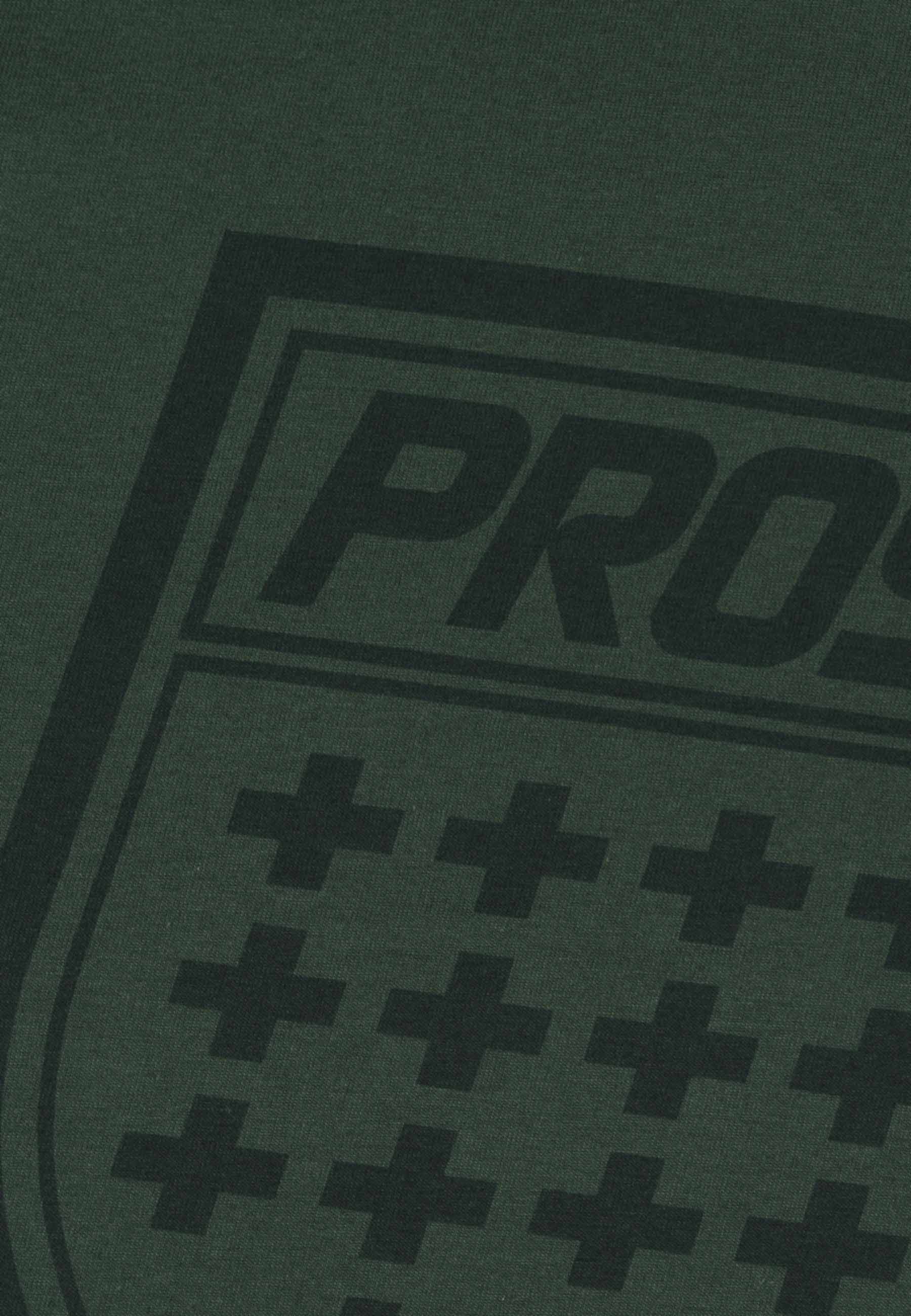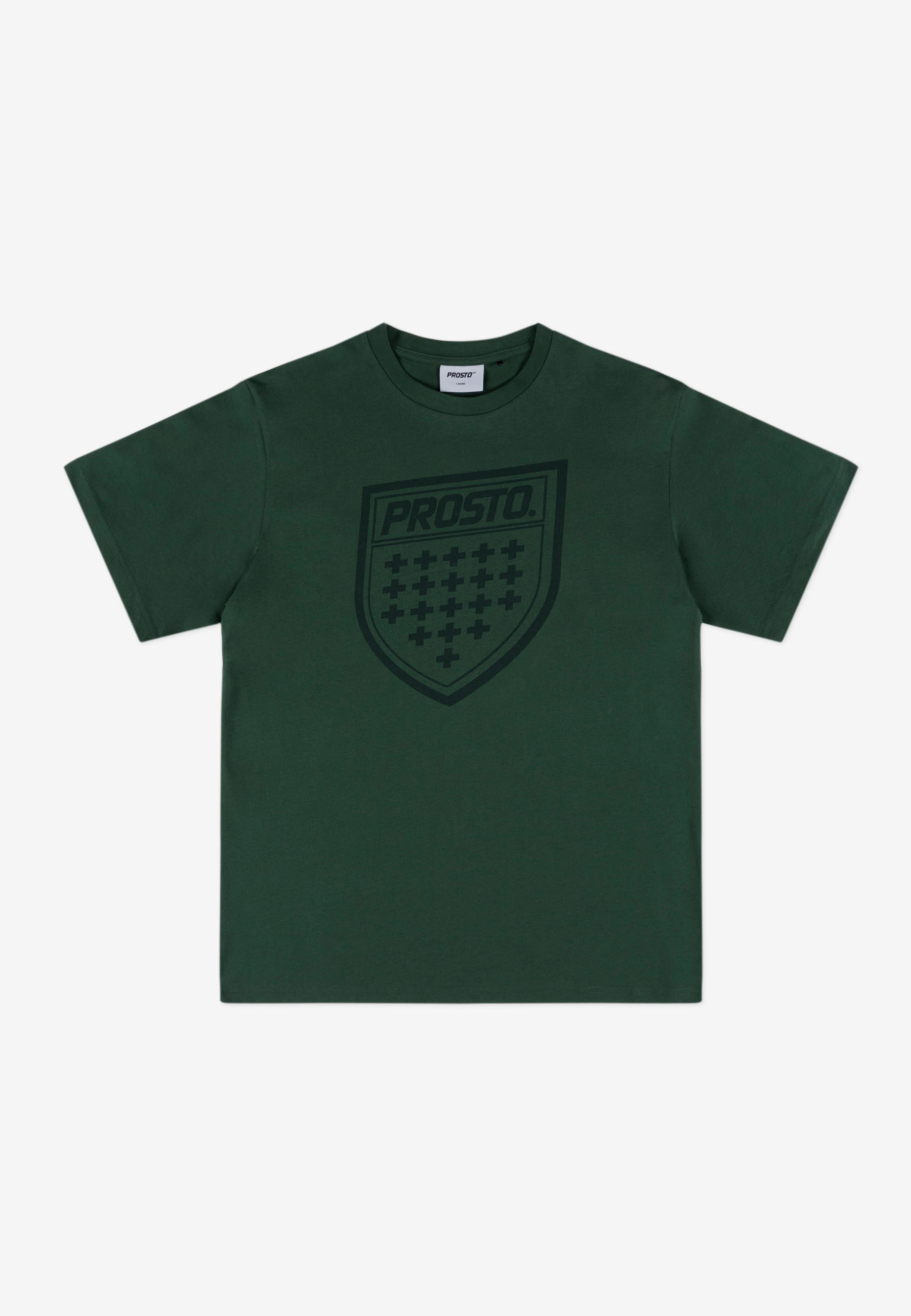 T-shirt Shield Khaki – klasyczna koszulka z kolekcji Prosto, będąca częścią dropu opartego na motywie kultowej tarczy marki. Nadruk wykonany metodą lasera wtapia się w tkaninę, tworząc efekt tonalnego, nowoczesnego wykończenia. Regularny krój i lekka bawełna zapewniają komfort w codziennym noszeniu. T-shirt doskonale sprawdzi się zarówno solo, jak i jako baza pod bluzę czy kurtkę.
