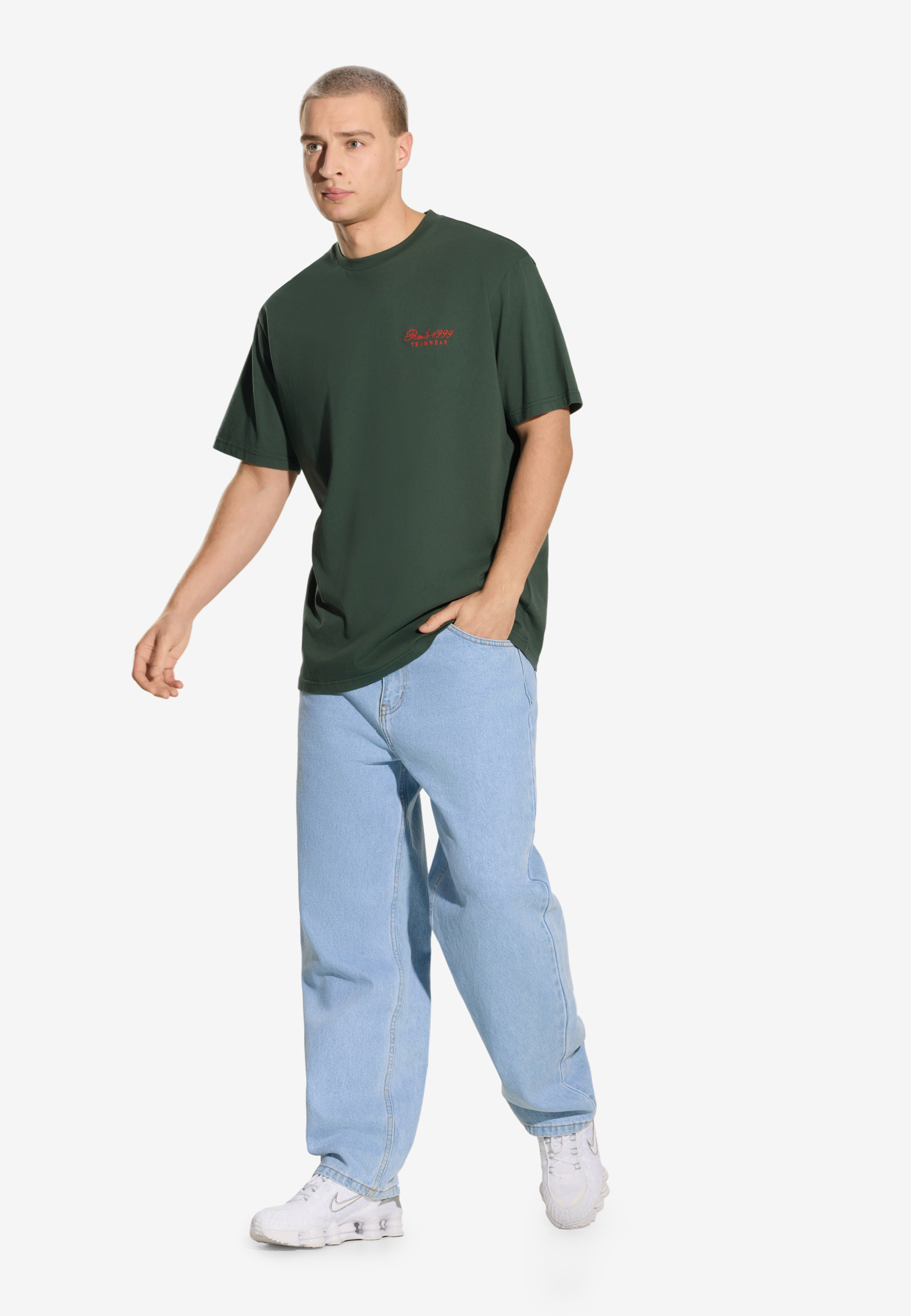 T-shirt Team Khaki – klasyczny T-shirt w odcieniu khaki z efektem sprania, który nadaje mu surowego, lekko vintage’owego charakteru. Ma regularny krój i subtelny haft Prosto Teamwear na piersi, inspirowany sportową estetyką. Miękka bawełniana dzianina sprawia, że koszulka jest przyjemna w dotyku i dobrze układa się na sylwetce. Idealna do noszenia na co dzień – solo lub pod bluzę.