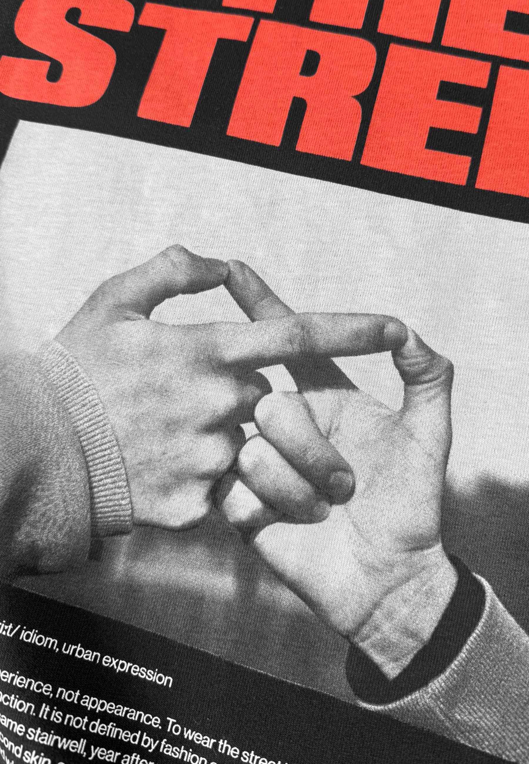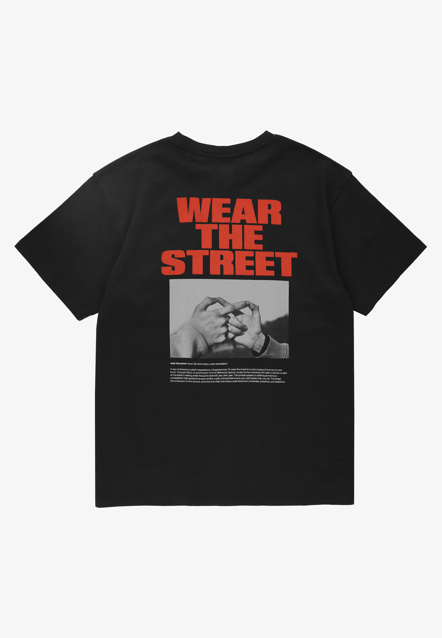 T-shirt Wear The Street Black – męska koszulka z kolekcji Prosto, która zamienia hasło marki w czytelny manifest. Oversize’owy krój daje luz i proporcje, a czarna baza buduje mocne tło dla grafiki. Na plecach hasło „Wear The Street” połączone z fotografią dłoni układających się w symbol nieskończoności – znak, że street to ciągły ruch, bez granic i bez końca. Z przodu minimalistyczne logo, które równoważy całość. Koszulka, która w czerni mówi najwięcej.