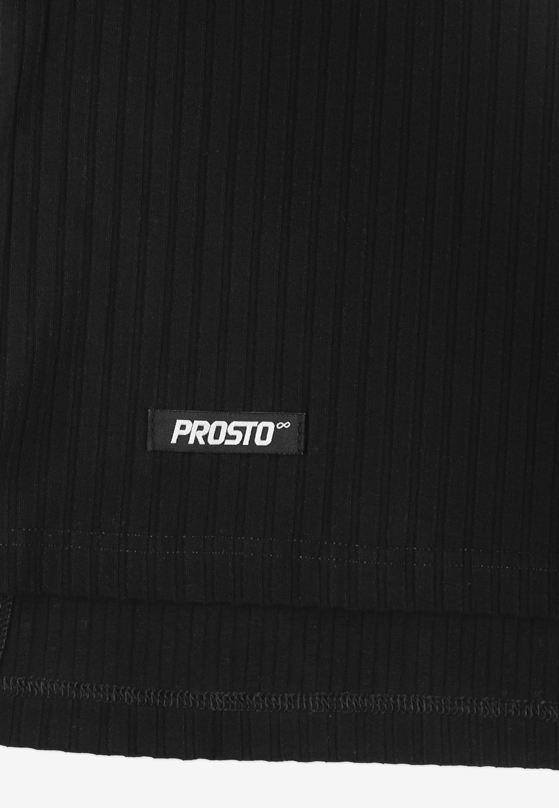 Top Bamboo Black – damski top z kolekcji Prosto w klasycznym, czarnym kolorze. Wykonany z miękkiej dzianiny bambusowej z dodatkiem elastanu, jest lekki, delikatnie elastyczny i przyjemny dla skóry. Półprześwitujący materiał o prążkowanej strukturze subtelnie podkreśla sylwetkę, zapewniając jednocześnie komfort i przewiewność. Regularny krój sprawia, że top dobrze układa się na ciele i pasuje zarówno do casualowych, jak i bardziej dopracowanych stylizacji. Całość uzupełnia minimalistyczna metka żakardowa z logo Prosto.