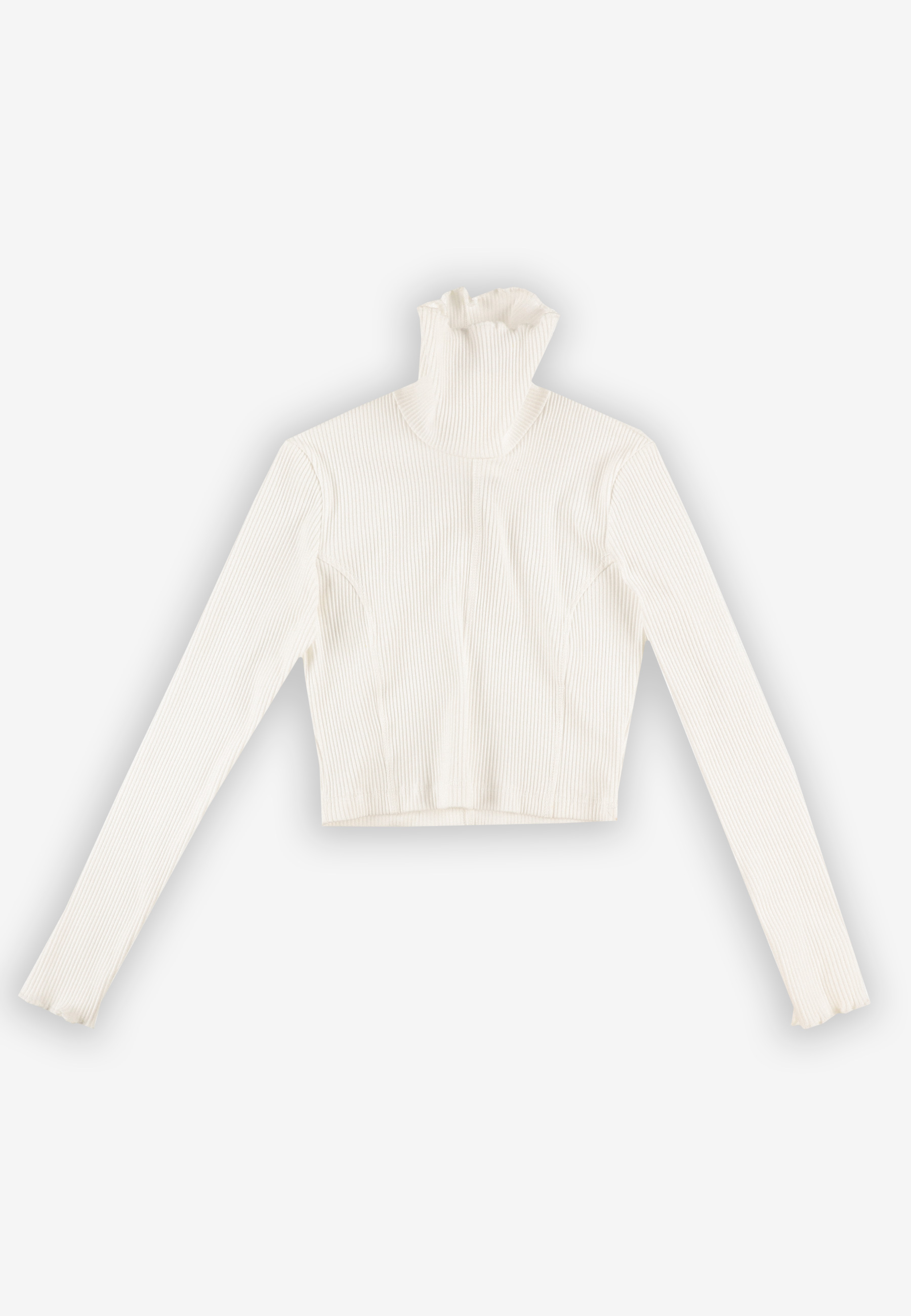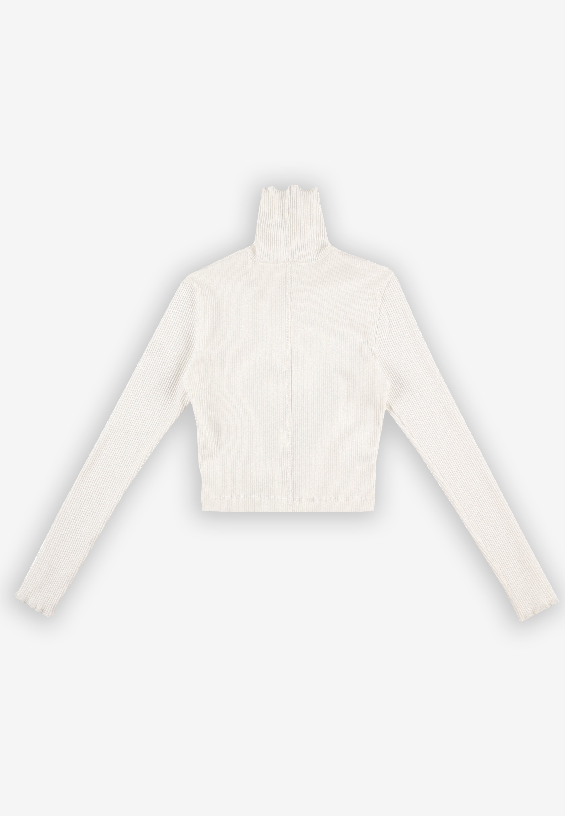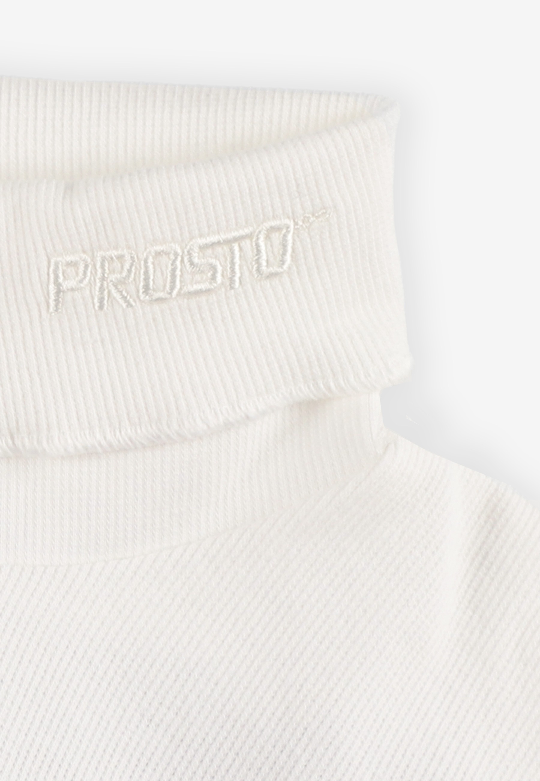 Turtleneck Ribbed Off-White – dopasowany damski longsleeve z kolekcji Prosto w odcieniu off-white. Ma krótki, taliowany krój i ozdobny golf, który delikatnie podkreśla linię szyi. Wykonany z elastycznej, prążkowanej dzianiny bawełnianej z dodatkiem elastanu. Przeszycia optycznie modelują sylwetkę, nadając całości charakter. To kobiecy, dopracowany model, który łączy wygodę i estetykę.