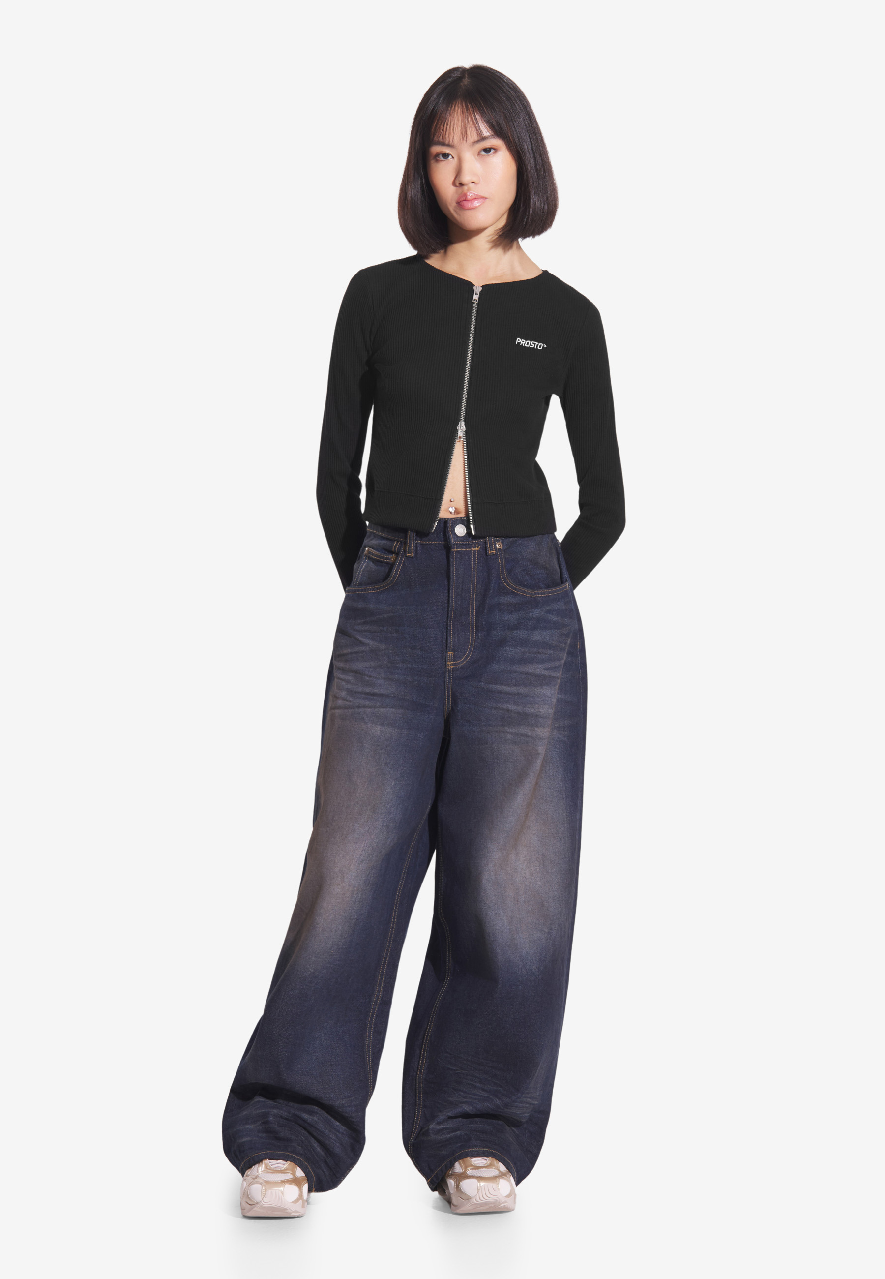 Zip Sweatshirt Ribbed Black – taliowany damski longsleeve z kolekcji Prosto w klasycznym, czarnym kolorze. Wykonany z elastycznej, prążkowanej dzianiny bawełnianej z dodatkiem elastanu. Ten dopasowany top podkreśla sylwetkę, zapewniając jednocześnie ciepło i komfort noszenia. Dwustronny metalowy zamek na całej długości pozwala na różne sposoby dopasowania i stylizacji – od subtelnego rozpięcia po bardziej odważne formy. To model, który łączy kobiecy krój z nowoczesnym, streetowym charakterem.